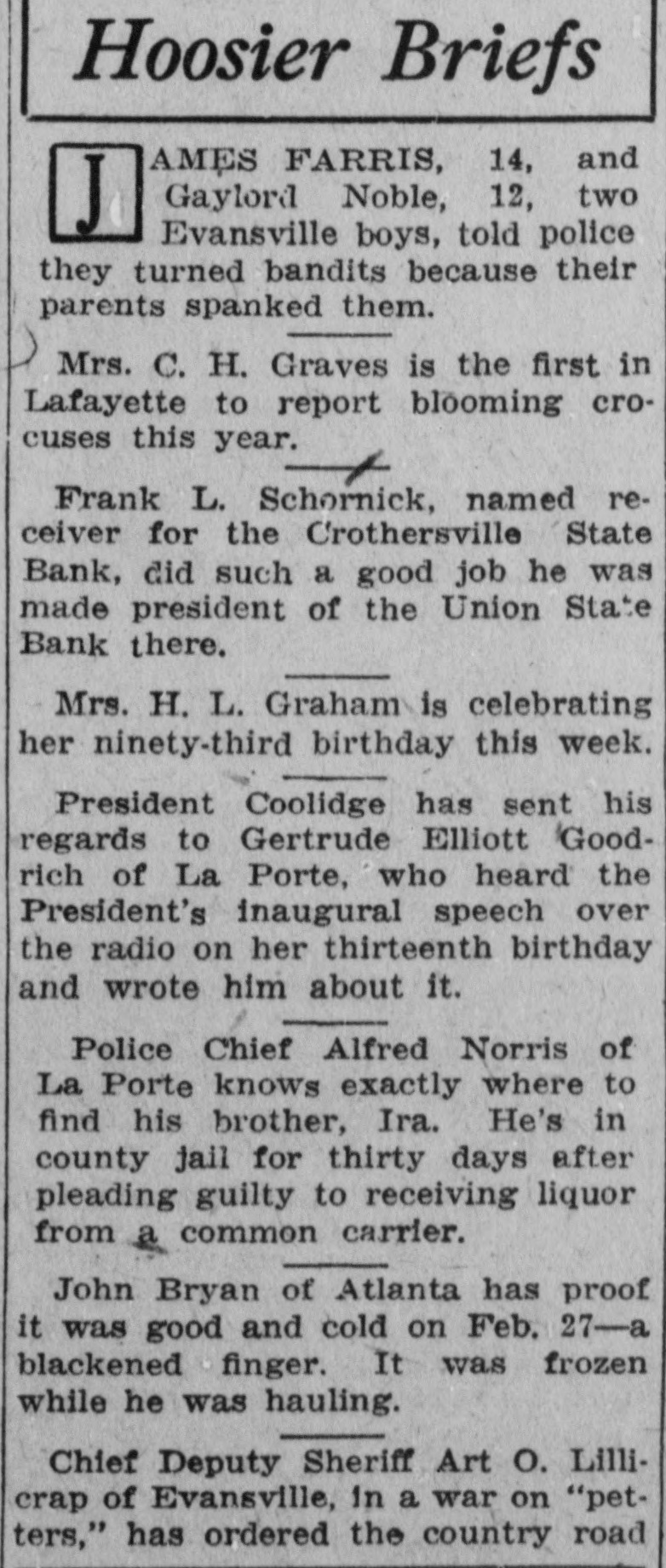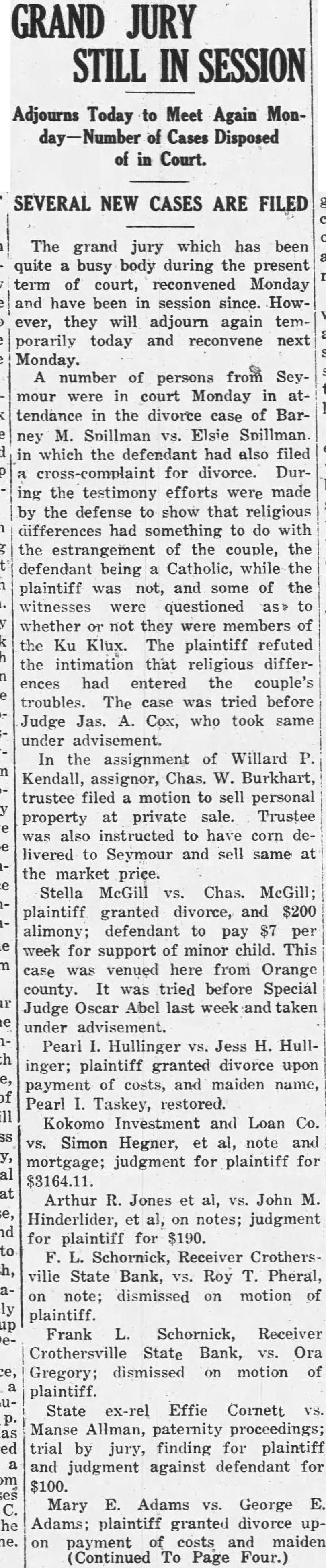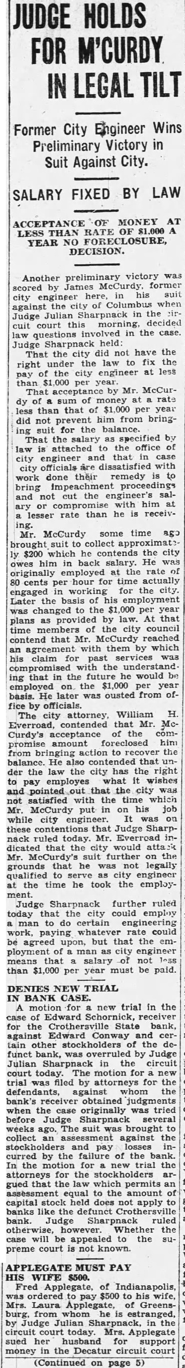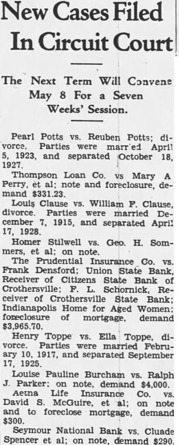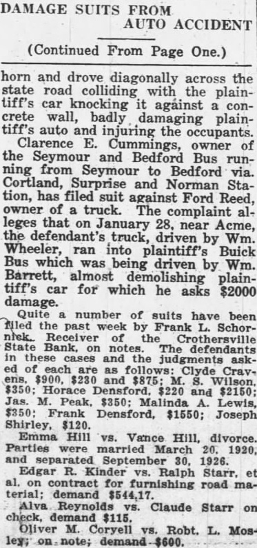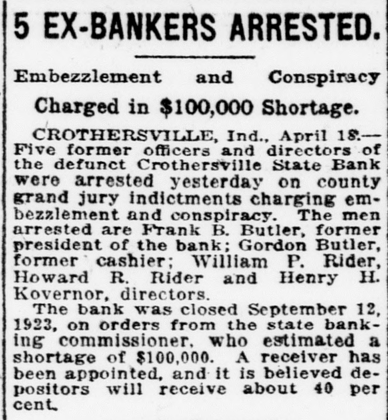 The long drawn out suit by Frank Schornick, receiver, against the directors of the deffunet Crothersville State Bank for damages has been officially settled following compromise by which the defendants agreed the receiver $10,000, The case was settled Monday when called for trial in the Bartholomew circuit court at Columbus. The compromise was made legal and binding by being made matter of court record judgment for $10,000 against the defendants, of the attorneys stated today. The attorneys for the receiver greed to settlement of $10,000, understood, after they learned that the defendants became directors the bank in at time when was already insolvent. When the defendants were made directors of the institution held approximately $80,000 of uncollectible paper. Recovery against the defendants was limited to the payment of dividends after they went into office and other minor items. Court action staid for sixty days to give the defendants time arrange the details of paying the $10,000. said there is priarrangement between them as to the apportionment of the sum. The directors of the defunet bank Frank Butler, William Rider, the administratrix for the esof tafe of the Howard R. Rider, Henry Kovenor, Henry Beckman and Sylvester Applegate. The theory underlying the suit as expressed, was that the directors of the bank had been administering the negligent affairs of the bank and that this had resulted in large losses to the depositors. The suit was filed March 12, 1924, in the Jackson circuit eourt and was sent to the Bartholomew circuit court on change of venue, being set for trial Monday. The case was called before Judge Julian Sharpnack, and the compromise was reached before the jury called. Seba Barnes and Montgomery Montgomery, of this city, were attorneys for the receiver, while the defendants were represented by Shea & Hottel, of Indianapolis: Thomas M. Branaman and John Branaman, of Brownstown; Edward Elsner and Oscar Abel, this city, and Kollmeyer and dear, of Columbus. This is one of the most important cases filed in connection with the ceivership of the Crothersville State of Bank. The maze of legal actions rapidly being cleared away, looking towards final settlement of the ceivership, which started following failure of the bank September 12, 1923. The against Frank Butler, former president of the for $10,000 on personal bond, still pending. Sweet Sweet, contractors of Greencastle, also have pending against the receiver. contractors allege that posited $3,800 in the bank several before was closed, and seek days recovery upon the ground that offiof bank are liable when they cers receive deposits knowing bank is insolvent.