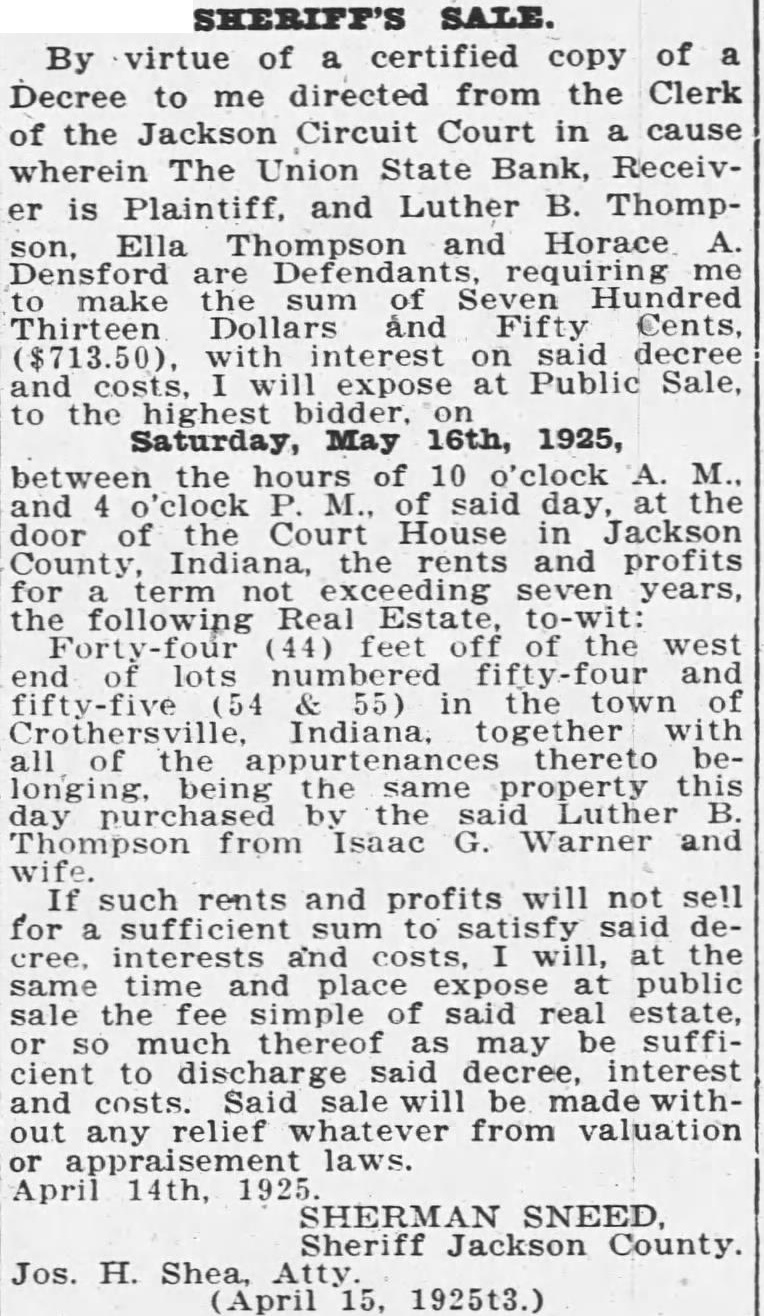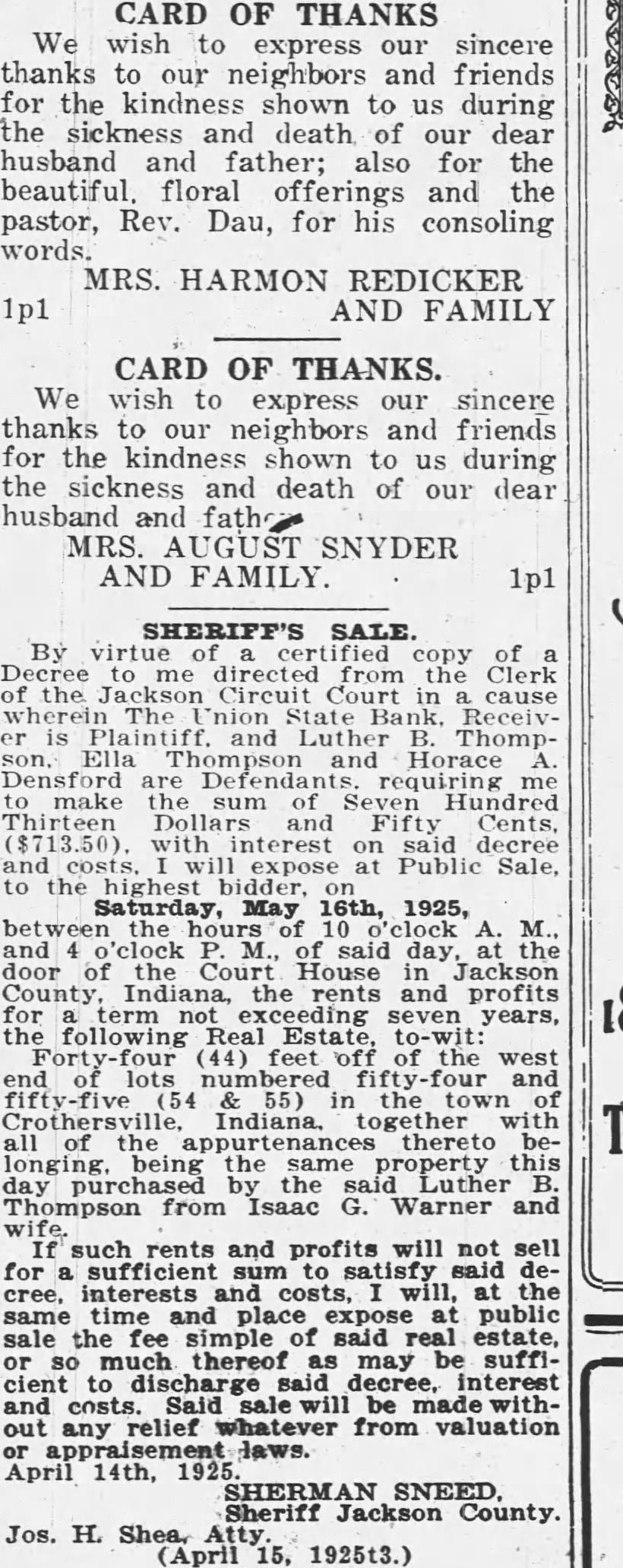 CARD OF THANKS We wish to express our sincere thanks to our neighbors and friends for the kindness shown to us during the sickness and death of our dear husband and father; also for the beautiful, floral offerings and the pastor, Rev. Dau, for his consoling words. 1p1 MRS. HARMON REDICKER AND FAMILY CARD OF THANKS. We wish to express our sincere thanks to our neighbors and friends for the kindness shown to us during the sickness and death of our dear husband father MRS. AUGUST SNYDER AND FAMILY. 1p1 SHERIFF'S SALE. By virtue copy Decree me directed from the Clerk of the Jackson Circuit Court in cause wherein "nion State Bank. Receiver Plaintiff and Luther Thompson. Thompson and Horace Densford are Defendants requiring me make the sum of Seven Hundred Thirteen Dollars and Fifty Cents, ($713.50) with interest on said decree and costs. will expose at Public Sale, to the highest Saturday, May 16th, 1925, between the o'clock A. M. and o'clock M. said day, door of the Court House in Jackson County. Indiana, the rents and profits for the following term not Real exceeding Estate. seven to-wit: years, Forty (44) feet of the west lots fifty-four and (54 55) in the town Crothersville, Indiana. together with all of the appurtenances thereto belonging, being the same this day purchased by the said Luther Thompson from Isaac G. Warner and wife. such rents and profits will not sell for sufficient sum to satisfy said decree, interests and costs, will, at same time and place expose at public sale the fee simple of said real estate, or so much thereof as may be sufficient to discharge said decree, interest and costs. Said sale will be made without any relief whatever from valuation laws. April 14th, 1925 Sheriff Jackson County. Jos. H. Shea, (April 15, 1925t3.)
