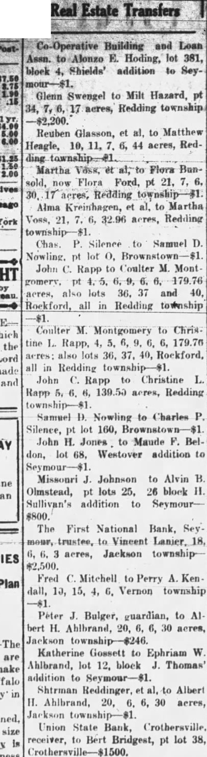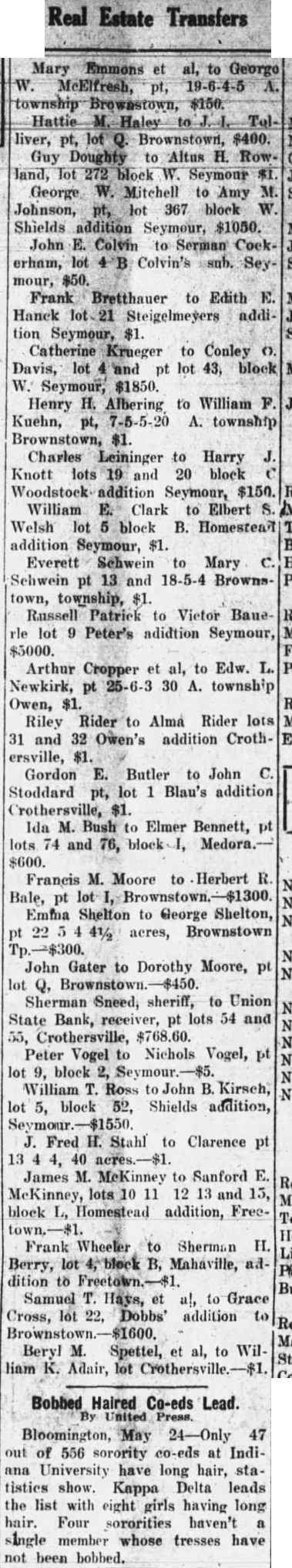 Real Estate Transfers Mary Emmons et al, to George W. McElfresh, pt, 19-6-4-5 A. township Brownstown, $150. Hattie M. Haley to Tolliver, pt, lot Q. Brownstown, $400. Guy Doughty to Altus H. Rowland, lot 272 block W. Seymour $1 George W. Mitchell to Amy M. Johnson, pt, lot 367 block W. Shields addition Seymour, $1050. John E. Colvin to Serman Cockerham, lot 4B Colvin's sub. Seymour, $50. Frank Bretthauer to Edith E. Hanck lot-21 Steigelmeyers addition Seymour, $1. Catherine Krueger to Conley O. Davis, lot and pt lot 43, block W. Seymour, $1850. Henry H. Albering to William F. Kuehn, pt, 7-5-5-20 A. township Brownstown, $1. Charles Leininger to Harry J. Knott lots 19 and 20 block e Woodstock addition Seymour, $150. William E. Clark to Elbert S. Market Welsh lot 5 block B. Homestead Top addition Seymour, $1. Everett Schwein to Mary c. Schwein pt 13 and 18-5-4 Brownstown, township, $1. Russell Patrick to Victor Bauerle lot 9 Peter's adidtion Seymour, $5000. Arthur Cropper et al, to Edw. L. Newkirk, pt 25-6-3 30 A. township Owen, $1. Riley Rider to Alma Rider lots 31 and 32 Owen's addition Crothersville, $1. Gordon E. Butler to John C. Stoddard pt, lot 1 Blau's addition Crothersville, $1. Ida M. Bush to Elmer Bennett, pt lots 74 and 76, block Medora. $600. Francis M. Moore to Herbert R. Emma Shelton to George Shelton, pt 22 5 4 41/2 acres, Brownstown John Gater to Dorothy Moore, pt lot Q, Brownstown.-$450 Sherman Sneed, sheriff, to Union State Bank, receiver, pt lots 54 and 55, Crothersville, $768.60. Peter Vogel to Nichols Vogel, pt lot 9, block 2, Seymour. William T. Ross to John B. Kirsch, lot 5, block 52, Shields addition, J. Fred H. Stahl to Clarence pt 13 4 4, 40 acres.-$1. James M. McKinney to Sanford E. McKinney, lots 10 11 12 13 and 15, block L, Homestead addition, FreeFrank Wheeler to Sherman H. Berry, lot 4, block B. Mahaville, addition to Freetown.-$1. Samuel T. Hays, et al, to Grace Cross, lot 22. Dobbs' addition to Brownstown.-$1600. Beryl M. Spettel, et al, to William K. Adair, lot Crothersville.-$1. Bobbed Haired Co-eds Lead. Bloomington, May 24-Only 47 out of 556 sorority co-eds at Indiana University have long hair, statisties show. Kappa Delta leads the list with eight girls having long hair. Four sororities haven't a single member whose tresses have not been bobbed.