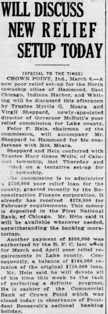 WILL DISCUSS NEW RELIEF SETUP TODAY [SPECIAL THE TIMES) CROWN POINT. Ind., for the North township cities of Indiana and Whiting will discussed this afternoon by Trustee Myrtle Meara and Virgli Sheppard, director poor relief for Lake county. Peter Hein, of commission, Mr. Sheppard to Hammond for his conMrs. Meara. Sheppard Hein conferred with Mary Wells, of Calulast tentative set-up for to poor relief for the county, recently the ReFinance already has received $278,000 This money deposited the First National Bank, of Chicago. said will available needed, the banking moratorium. Another payment $308,000 the last for March and April poor relief Lake county. Conbalance of the original Mr. Hein devote his time this week the task perfecting definite program. He cashier of the Commercial Bank Crown Point which was closed today of President Roosevelt's national banking holiday.