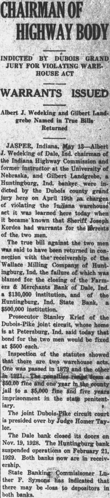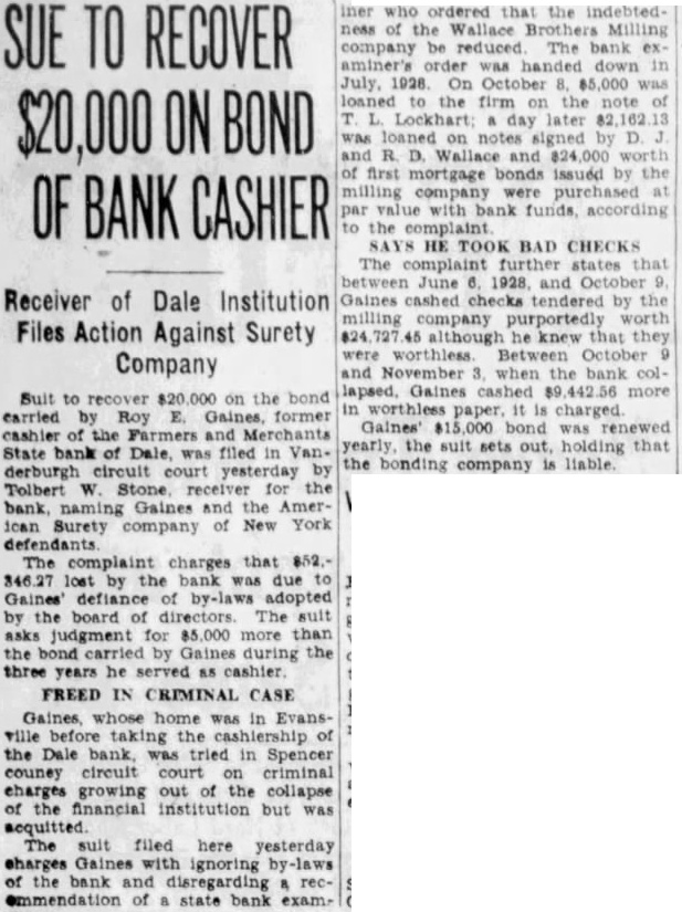 Seventy-four stockholders of the defunct Farmers and Merchants State bank of Dale were named defendants in suit for $25,000 filed in Spencer county circuit court today by Frank Schroer in behalf of all creditors of the bank. No officers or directors of the bank are named in the suit which seeks application of stockholder's statutory liability law. The complaint charges that the bank is indebted to creditors to the extent of $140,000 and that assets do not exceed $100,000.