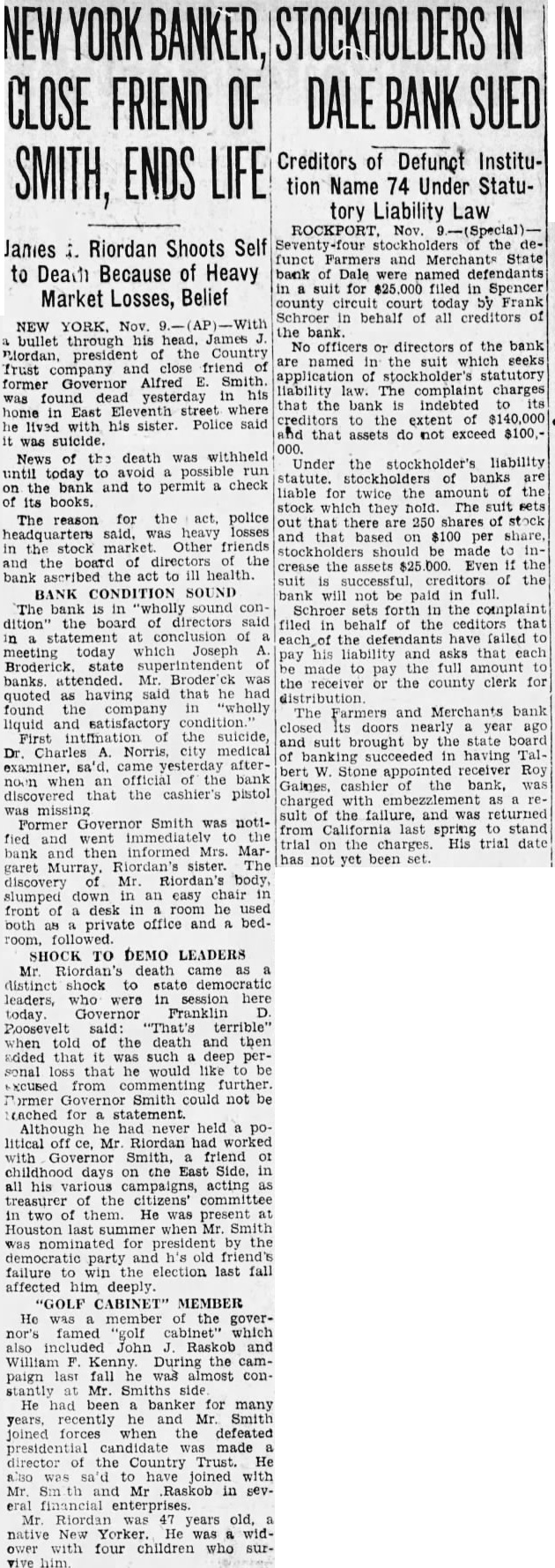 NEW YORK, Nov. bullet through his head, James Blordan, president of the Country frust company and close friend of former Governor Alfred E. Smith. was found dead yesterday in his home in East Eleventh street where he lived with his sister. Police said it was suicide. News of the death was withheld until today to avoid possible run on the bank and to permit check of its books. The reason for the act, police headquarters said, was heavy losses in the stock market Other friends and the board of directors of the bank ascribed the act to ill health. BANK CONDITION SOUND The bank is in "wholly sound condition' the board of directors said in statement at conclusion of meeting today which Joseph Broderick state superintendent of banks. attended. Mr. Broder'ck was quoted as having said that he had found the company in "wholly liquid and satisfactory condition First intimation of the suicide, Dr. Charles A. Norris, city medical examiner. sa'd. came yesterday afternoon when an official of the bank discovered that the cashier's pistol was missing Former Governor Smith was notified and went immediately to the bank and then informed Mrs. Margaret Murray. Riordan's sister. The discovery of Mr. Riordan's body, slumped down in an easy chair in front of desk in room he used both as private office and bedroom, followed. SHOCK TO DEMO LEADERS Mr. Riordan's death came as distinct shock to state democratic leaders, who were in session here today Governor Franklin D. Poosevelt said: "That's terrible" when told of the death and then added that it was such deep personal loss that he would like to be **cused from commenting further. Former Governor Smith could not be for a statement. Although he had never held a political off ce, Mr. Riordan had worked with Governor Smith, friend or childhood days on the East Side, in all his various campaigns, acting as treasurer of the citizens' committee in two of them. He was present at Houston last summer when Mr. Smith was nominated for president by the democratic party and h's old friend's failure to win the election last fall affected him deeply. "GOLF CABINET" MEMBER He was member of the governor's famed "golf cabinet" which also included John J. Raskob and William F. Kenny. During the campaign last fall he was almost constantly at Mr. Smiths side He had been banker for many years, recently he and Mr. Smith joined forces when the defeated presidential candidate was made director of the Country Trust. He also was sa'd to have joined with Mr. Sm th and Mr Raskob in several financial enterprises. Mr Riordan was 47 years old, native New Yorker. He was widower with four children who survive him