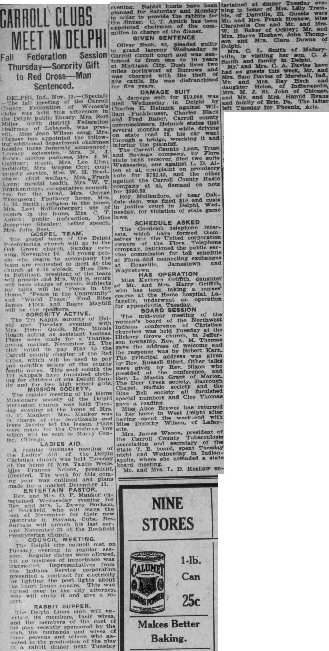 CARROLL CLUBS IN DELPHI MEET Session Fall Federation Thursday-Sorority Gift to Red Cross-Man Sentenced. DELPHI, Ind., Nov. the (Special) Carroll A damage suit for $10,000 was fall meeting of Wednesday in Delphi filed Women's County Federation Charles E. Helmick against Black Wilthis afternoon in clubs held Charles library. Mrs. Bert the Delphi public Carroll county and Fred Raber, district Federation ninth Helmick states that of Lebanon, was preschairman several months ago while driving went Wilson sang. Mrs. Miss Jean road 29, his car the follow. on through state bridge, wrecking it and Clauser has appointed ing chairmen plaintiff. injuring the County Loan, Trust besides those formerly announced: N. The Carroll extension, Mrs. Library and Savings company, by Flora pictures, Mrs. M. Howe: motion state bank receiver, filed two suits Mrs. Leo Ulm; Gardner: music, one against L. D. AIpublicity, Mrs. Wayne Brad- com- complaint on promisory len et al, Mrs. W. H. munity and the other for $762.43, welfare, Mrs. Frank child against note the Carroll County Radio Lyon mental health, Mrs. W. demand on note company et al, co-operative commitGeorge for the Mrs. tee for of OakMullendore, near Fontleroy home, Mrs. dale Roy dam, was fined $10 costs Smith religion in the home, H. in justice court in Delphi, WedMrs. Levi Rothenberger: use nesday, for violation of state game leisure the home, Mrs. in Miss laws. public instruction, Amick SCHEDULE ASKED Josephine Shealey; better speech, The Goodrich telephone interMrs. John TEAM: have formed themGOSPEL which Delphi selves ests, into the United corporation The gospel team of the church will go the owners the Flora Telephone Oak Grove church, Sunday company, petitioned the public serning. 16. All young peo- vice for toll schedule ple who desire to accompany the connecting exchanges team are requested to meet at the Jamestown and Rossville, church at 6:15 o'clock. Miss GreWaynetown. president of the team HAS OPERATION ta will preside and Mrs. Will S. Smith daughter Miss Kathryn Griffith, will have charge of music. Mrs. Harry Griffith, of Mr. and will be "Peace in the nurses' for talks has been taking who in the course at the Home hospital, Laand "World Peace.' Fred Sites fayette, under an operation James Flora and Roger Mayhill for Tuesday. will be BOARD SESSION SORORITY ACTIVE. The mid-year meeting Northwest of the The Tri Kappa sorority of with Del- board of the Tuesday evening woman's Indiana conference of Christian Mrs. Heten Quick, Mrs. Minnie churches was held Tuesday at the Roach acting assistant hostess. Hickory Grove in Thomas Jefferwere for ThanksRev. M. giving Plans market, November 22. The gave son the of welcome and club voted to pay $150 to the the response was by Robert Karn. Carroll county chapter of the Red The principal address was given which will be used to pay Cross, by Rev. Russell Sifert. Other talks salary of the county month's health nurse. This past month the were given Rev. Nixon who and the conference, furnished clothpresided Rev. Martin Grant of Marion. children of one Delphi famfor The Deer Creek society, Darrough school girls. and Chapel, Buffalo society and the MISSION SOCIETY. Home Blue Bell society all furnished The regular of the Delphi special numbers and Cleo Thomas society of the gave reading. Methodist church was held TuesBrewer has returned Miss Alice day evening at the home of Mrs. West Delphi after Mrs. Manker was to her home in the with the devotionals and charge of having Mise Dorothy spent Wilson, of Lafayled the lesson. Plans Irene Jacoby for the Christmas box were made which will be sent to Marcy Cen- Mrs. James Wason, president of the Carroll County Tuberculosis ter, Chicago LADIES AID. association and secretary of the business meeting of State B. board, spent Tuesday regular Aid of the Delphi night and Wednesday in IndianLadies' Christian church was held Tuesday apolis, where she attended a state at the home of Mrs. Yantis Wells. board meeting president, L. D. Hoshaw enMiss Frances Nelson, Mr. and Mrs. presided. The work for this coming year was outlined and plans market December 13. made ENTERTAIN PASTOR. Rev. and Mrs. O. P. Manker entertained Wednesday evening for NINE and Mrs. Burham, who will leave the last for their new pastorate in Havana, Cuba. Rev. Burham will preach his ser- STORES mon November 23 at the Rockfield COUNCIL MEETING. The Delphi city council met on Tuesday evening in regular session. Regular claims were allowed, but no business of importance was transacted. Representatives from the Indiana Service corporation presented contract for electricity Can lighting the post lights about the court This was turned to the city attorney, who will study it and give re25c port. RABBIT SUPPER. The Delphi Lions club will entertain members, their wives, its and the members the cast Makes Better the play recently by the club, the husbands and wives of and others who Baking. the production of the play rabbit dinner next Tuesday evening. Rabbit hunts have been planned for Saturday and Monday order to provide the rabbits been for T. Amick has the dinner. chairman of the comappointed mittee in charge of the dinner. GIVEN SENTENCE Bush, 42, pleaded guilty Oliver grand larceny Wednesday in Carroll court and was sentenced to one to 10 years at Michigan City. Bush lives two northwest of Burrows and miles was charged with theft He was disfranchised five cattle. for five years. DAMAGE SUIT dinner Tuesday evetertained at of Mrs. Lilly Tremning in honor Guests were ble, of Danville, Frank Hoshaw, Miss Mr. and Mrs. Clarabelle Coe and Mr. and Mr. Mrs. and E. Baker of Mrs. W. Harve John ThompMrs. Clara Downs of son and Delphi. Mrs. C. L. Smith of Medary. visiting her son, C. is Smith ville, and family in Delphi. Mr. and Mrs. Davies have had as guests this week, Mr. and Mrs. Sam Davies of Marshall, Ind., and Mrs. Ray Heck Mr. and Helen, of Indianapolis, daughter M. St. John of Chicago, Mrs. Mr. and Mrs. Harold Evans and famil