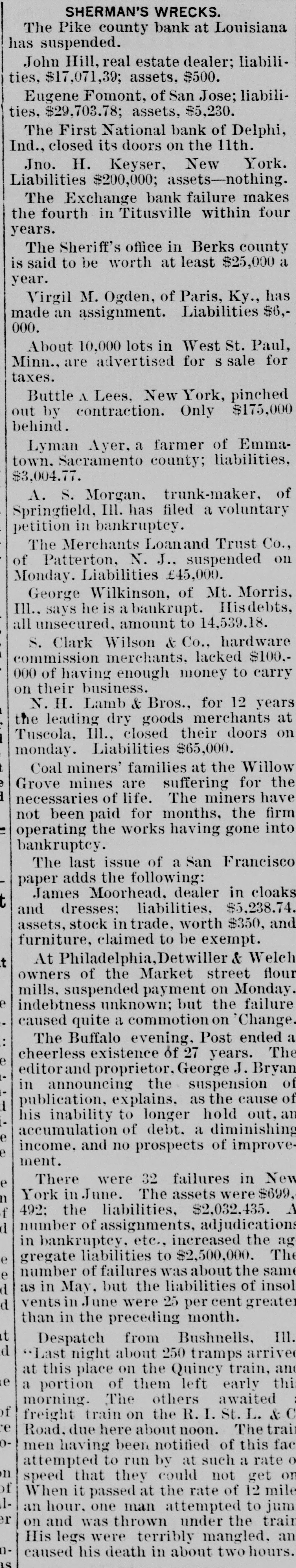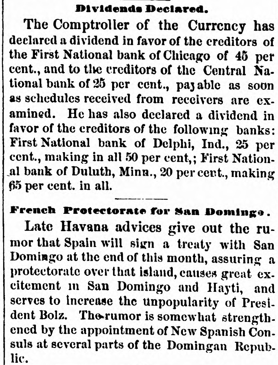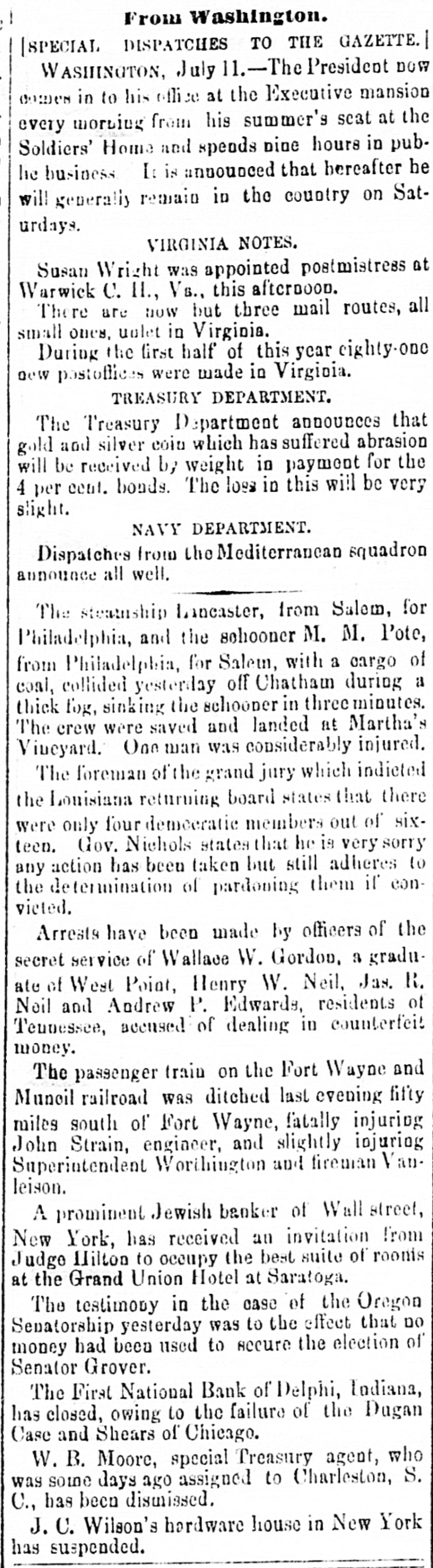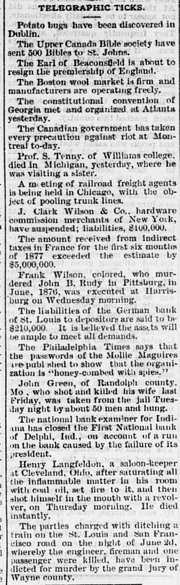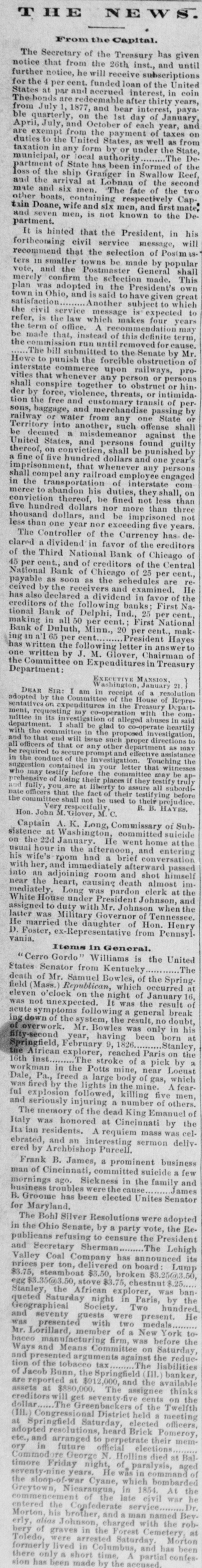 NEWS. From the Capital. The Secretary of the Treasury has given notice that from the 26th inst., and until further notice, he will receive subscriptions for the 4 per cent. funded loan of the United States at par and accrued interest, in coin The bonds are redeemable after thirty years, from July 1, 1877, and bear interest, payable quarterly, on the 1st day of January, April, July, and October of each year, and are exempt from the payment of taxes on duties to the United States, as well as from taxation in any form by or under the State, municipal, or local authority ********* The Department of State has been informed of the loss of the ship Granger in Swallow Reef, and the arrival at Lobnau of the second mate and six men. The fate of the two other boats, containing respectively Captain Doane, wife and six men, and first mate, partment. and seven men, is not known to the DeIt is hinted that the President, in his forthcoming civil service message, will recommend that the selection of Postm is. ters in smaller towns be made by popular vote, and the Postmaster General shall merely confirm the selection made. This plan was adopted in the President's own town in Ohio, and is said to have given great satisfaction Another subject to which the civil service message is expected to refer, is the law which makes four years the term of office. A recommendation may be made that, instead of this definite term, the commission run until removed for cause. The bill submitted to the Senate by Mr. Howe to punish the forcible obstruction of interstate commerce upon railways, provitles that whenever any person or persons shall conspire together to obstruct or hinder by force, violence, threats, or intimidation the free and customary transit of persons, baggage, and merchandise passing by railway or water from any one State or Territory into another, such offense shall be deemed a misdemeanor against the United States, and persons found guilty thereof, on conviction, shall be punished by a fine of five hundred dollars and one year's imprisonment, that whenever any persons shall compel any railroad employee engaged in the transportation of interstate com merce to abandon his duties, they shall, on conviction thereof, be fined not less than five hundred dollars nor more than three thousand dollars, and be imprisoned not less than one year nor exceeding five years. The Controller of the Currency has declared a dividend in favor of the creditors of the Third National Bank of Chicago of 45 per cent., and of creditors of the Central National Bank of Chicago of 25 per cent., payable as soon as the schedules are received by the receivers and examined. He has also declared a dividend in favor of the creditors of the following banks; First National Bank of Delphi, Ind., 25 per cent., making in all 50 per cent.: First National Bank of Duluth, Minn., 20 per cent., making in n'l 65 per cent......... President Hayes has written the following letter in answer to one written by J. M. Glover, Chairman of the Department: Committee on Expenditures in Treasury EXECUTIVE MANSION. Washington, January DEAR SIR: I am in receipt of a resolution adopted by the Committee of the House of Representatives on expenditures in the Treasury Department, requesting my co-operation with the committee in its investigation of alleged abuses in said department. with I shall be glad to co-operate heartily the committee in the proposed investigation, and to that end will issue such proper directions to all officers of that or any other department as may be required to secure prompt and effective assistance in the conduct of the investigation. Touching the suggestion contained in your letter that witnesses who may testify before the committee may be apprehensive of losing their places if they testify truly and fully, you are at liberty to assure all subordinate officers that the fact of their testifying before the committee shall not be used to their prejudice. Very respectfully R. B. HAYES. Hon. John M. Glover, M.C. Captain A. K. Long, Commissary of Sub. sistence at Washington, committed suicide on the 22d January. He went home at the usual hour in the afternoon, and entering his wife's room had a brief conversation with her, and immediately afterward passed into an adjoining room and shot himself near the heart, causing death almost immediately. Long was pardon clerk at the White House under President Johnson, and assigned to duty with Mr. Johnson when the latter was Military Governor of Tennessee. He married the daughter of Hon. Henry D. vania. Foster, ex-Representative from PennsylItems in General. Cerro Gordo Williams is the United States Senator from Kentucky The death of Mr. Samuel Bowles, of the Springfield (Mass.) Republican, which occurred at eleven o'clock on the night of January 16, was not unexpected. It was the result of acute symptoms following a general break ing down of the system, the result, no doubt, of overwork. Mr. Bowles was only in his fifty-second year, having been born at Springfield, February 9, 1826. Stanley, the African explorer, reached Paris on the 16th inst. The stroke of a pick by a workman in the Potts mine, near Locust Dale, Pa., freed a large body of gas, which was fired by the lights in the mine. A fearful explosion followed, killing five men, and seriously injuring a number of others. The memory of the dead King Emanuel of Italy was honored at Cincinnati by the Ita ian residents. A requiem mass was celebrated, and an interesting sermon delivered by Archbishop Purcell. Frank B. James, a prominent business man of Cincinnati, committed suicide a few mornings ago. Sickness in the family and business troubles were the cause B. Groome has been elected Unites Senator James for Maryland. The Bohl Silver Resolutions were adopted in the Ohio Senate, by a party vote, the Republicans refusing to censure the President and Secretary Sherman The Lehigh Valley Coal Company has announced its prices per ton, delivered on board Lump