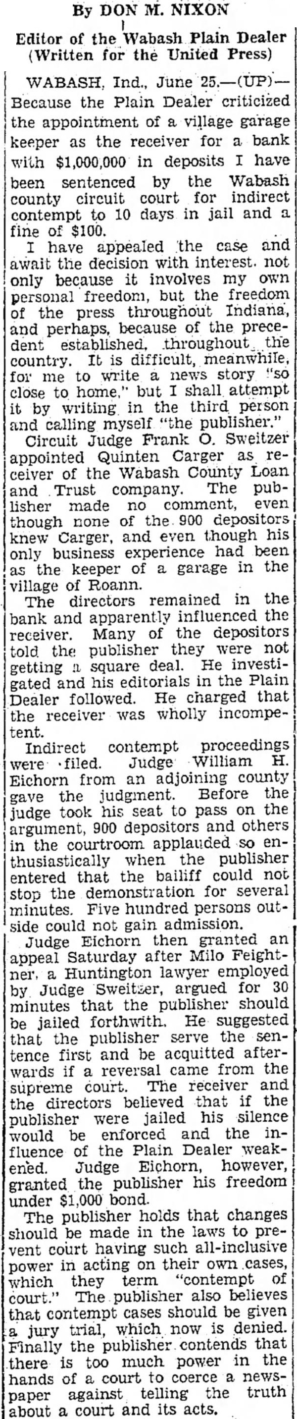 By DON M. NIXON Editor of the Wabash Plain Dealer WABASH, Ind., June cause the Plain Dealer criticized the of village garage the for 000,000 in deposits have sen- was wholly tenced by the Wabash county circuit court contempt to 10 days jail and fine of $100, have appealed the case and await the decision with interest, not only because it involves own personal freedom, the freedom the press throughout Indiana and perhaps because of the precedent established throughout the country. It diffimeanwhile, for me to write story close to home," but shall attempt it writing in the third person and calling myself "the Circuit Judge Frank O. Sweitzer appointed Quinten Carger receiver of the Wabash County Loan and Trust company publisher made no even though none of the 900 depositors knew Carger, and even though his only business experience been as the keeper of garage in the village Roann The directors remained in the bank and apparently influenced the ceiver. Many of the depositors told the they were not getting square He investigated and his the Plain Dealer followed. charged that the receiver Indirect were filed. Judge H. from an adjoining the judgment Before the judge took his seat to the 900 and in the courtroom applauded when the publisher that the bailiff could not stop the demonstration for several minutes. Five hundred persons outside could not gain admission Judge Eichorn then granted an appeal Saturday after Milo Feightner lawyer employed by Judge argued for 30 minutes the publisher be jailed forthwith He suggested that the publisher the first and be acquitted came from the supreme The receiver and that if the were jailed, his silence be enforced the influence the Plain Dealer weakened. Judge Eichorn, however, granted the publisher his freedom under $1,000 bond The publisher holds that changes should be made in laws to pre- by vent having such all-inclusive power in acting on their own cases, which term 'contempt of court." The publisher believes that contempt should be given trial. which now denied. Finally the that there is too the court against telling the truth about court and its acts