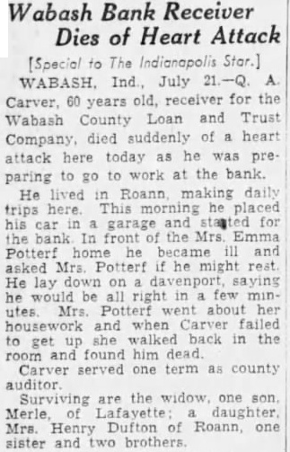 [Special to The Indianapolis Stor.] WABASH. Ind., July Carver, 60 years old, for the Wabash County Loan and Trust Company died suddenly of heart attack here today as he preparing go work at the bank. lived making daily He This morning placed his garage and In the Mrs Emma Potterf and asked Mrs. he He lay on saying would be few utes Potterf about her housework and when Carver failed walked back in the room and found him dead Carver served one term as county auditor are the widow. one son Henry Dufton of Roann, one sister and two brothers