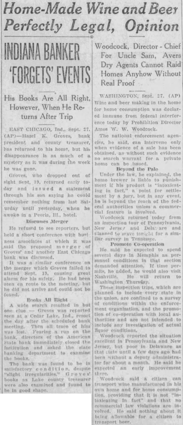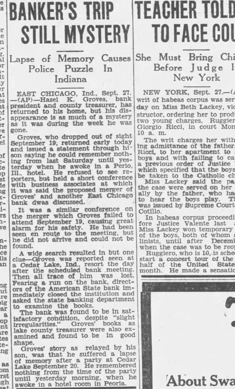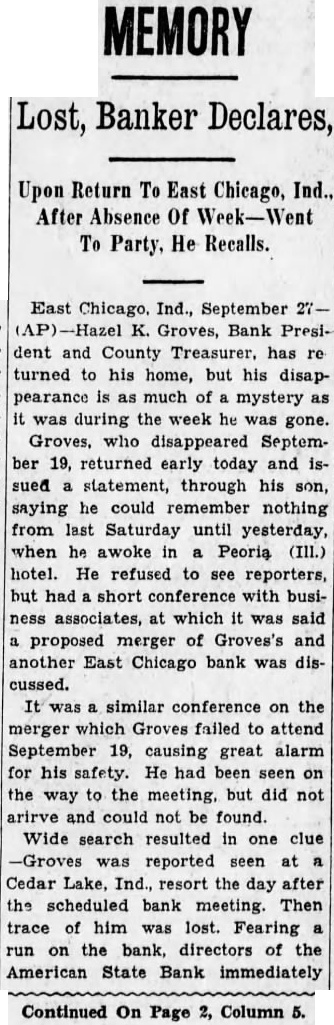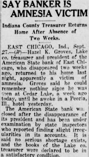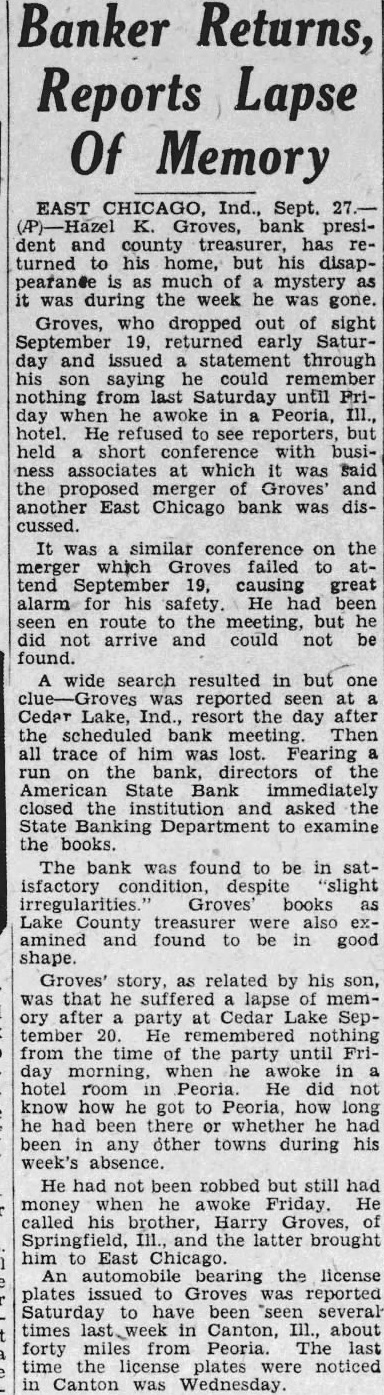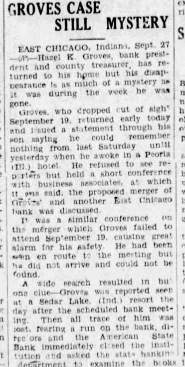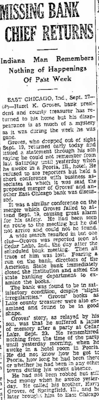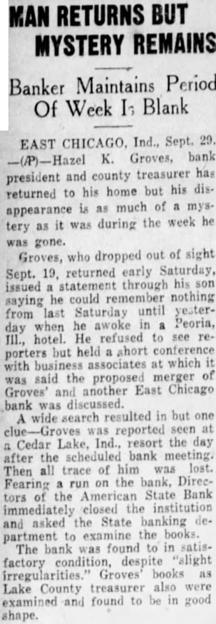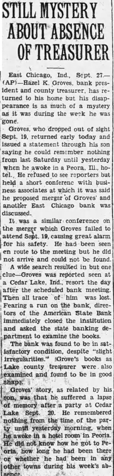 EAST CHICAGO, Ind., Sept. (AP)-Hazel Groves, bank president and county treasurer, has returned to his home, but his disappearance much mystery as it was during the week he was gone. Groves, dropped out sight September 19, early Saturday and issued statement through his saying could remember from last until Prihe awoke in Peoria, hotel. refused reporters, but held short conference with business associates which was said proposed merger Groves' and another East Chicago bank was discussed. It was similar conference on the merger which Groves failed to attend September 19, causing great alarm his safety. He been en route to the but did arrive and could not be A wide search resulted in but one reported Cedar Lake, Ind., resort the day after the scheduled bank meeting Then all trace of him was lost. Fearing run on the bank. directors of the American State Bank immediately closed the institution asked Department to examine the books. The bank was found to be in satisfactory condition, irregularities books as Lake County also amined and found to be in good Groves' story, as related by his son, was that he suffered lapse memory after party Cedar Lake September nothing from the time of the party until Friday morning, when he awoke in Peoria. He did not know how got to Peoria, how long he had there whether he had been any other towns during his absence. He had not been robbed but still had money he awoke Friday. He called his brother, Harry Groves, Springfield, III., the latter brought him to East Chicago. An automobile bearing the license plates issued to Groves was reported Saturday to been several times in Canton, about forty miles from Peoria. The last the plates were noticed in Canton was Wednesday.