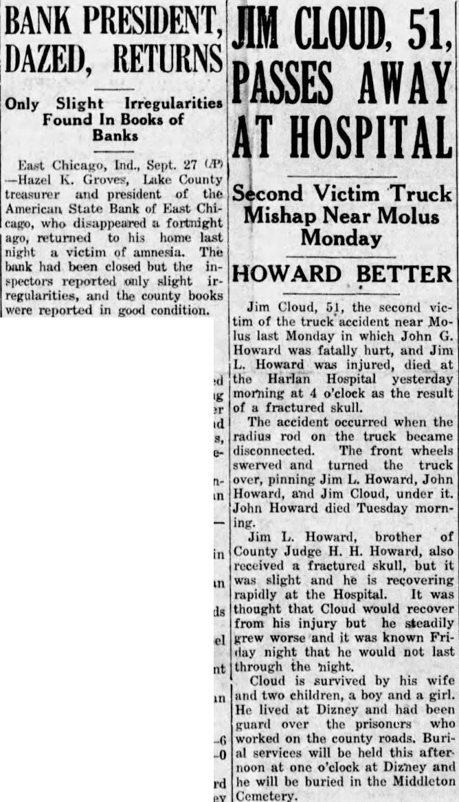 Jim Cloud, 51, the second victim of the truck accident near Molus last Monday in which John G. Howard was fatally hurt, and Jim Howard injured, died at the Harlan Hospital yesterday morning at o'clock as the result of fractured skull. The accident occurred when the radius rod on the truck became disconnected. The front wheels swerved and turned the truck over, pinning L. Howard, John Howard, and Jim Cloud, under it. John Howard died Tuesday morning. Jim L. Howard, brother of County Judge H. H. Howard, also received fractured skull, but it was slight and he is reçovering rapidly at the Hospital. It was thought that Cloud would recover from his injury but he steadily grew worse and it was known Friday night that he would not last through the Cloud is survived by his wife and two children, boy and girl. He lived at Dizney and had been guard over the prisoners who worked on the county roads. Buriservices will be held this after noon one o'clock at Dizney and he will be buried in the Middleton Cemetery.