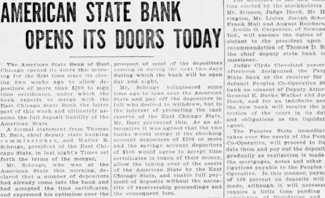 AMERICAN STATE BANK OPENS ITS DOORS TODAY of opened doors ing for first time since positors of than $200 to time under which expects East latter part of this and ultimately sume the full deposit liability of the American formal statement from Thomas D. chief deputy Schrage, of the East Chicago State, in last Times set forth the of the merger. Mr. Schrage, the American State this clared number of depositors already into the bank and had accepted the time certificates, expressed his optimism over the depositors Judge Clyde Cleveland afternoon designated the Peoples which the bank will be open State bank the receiver for the day and defunct Peoples Co-Operative State Mr. volunteered bank of Deputy Attorney General E. Burke Judge and pay the depositors and for full the will receive the the interest of the cash tection the court in of the East Chicago and obligations as the liquidating Mr. Barr prevented this. agent. that the The Peoples immediately the assets of the Peoples account of $200 or Co-Operative, proceed to liquiand the depositors date them and pay out the depositors of $100 would agree to accept gradually as realization made on token of their the notes and other allow the assets ligations payable to the Peoples Coof the American State by the East Operative. In manner, payment Chicago State, and full of 100 percent on deposits will ment deposits the necesmade, although will necessarily of receivership proceedings and sity require little time pending the the consequent loss.