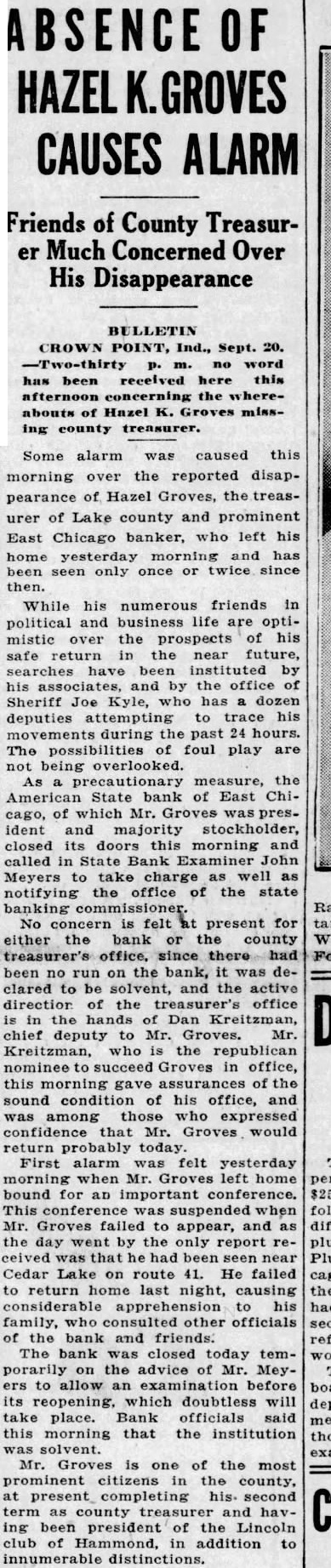 CROWN POINT, word received here this the abouts Hazel ing county treasurer. alarm caused this morning over the reported disappearance of Hazel Groves, treasurer of Lake county and prominent East Chicago banker, left his home yesterday morning been only once twice since then. While his numerous friends in political and business are optimistic over the prospects safe return the near future, instituted and by the office of Sheriff Joe Kyle, has dozen deputies attempting to trace his during the past 24 hours. The possibilities of foul play not being overlooked. measure, the American State bank of East Chicago, Mr. ident and majority stockholder, closed its doors morning and called Examiner John Meyers charge as notifying office of the state No concern felt present for either the bank or the county since been run on the bank, declared solvent, and the active direction of the treasurer's office in hands Dan Kreitzman, chief deputy Mr. Groves. Mr. Kreitzman, who the republican nominee succeed Groves in office, this morning gave assurances of the sound condition of his office, and among those who expressed confidence that Groves would probably today First alarm felt yesterday Mr. left home bound for an when Mr. Groves failed appear, and the went by only report ceived been near Cedar Lake on route 41. He failed to return home last night, causing the considerable his family, other officials of the bank and friends. The bank closed today temporarily on the advice of Mr. Meyallow examination before its reopening, which doubtless will place. Bank officials said this morning that the institution Mr. Groves is one of the most citizens the county, at present second county and having president of the Lincoln of Hammond, in addition to distinctions.