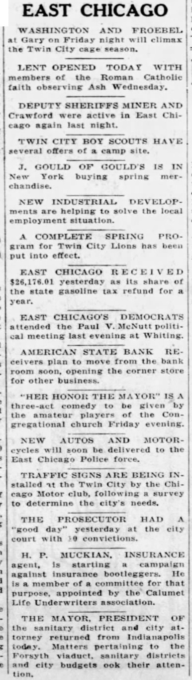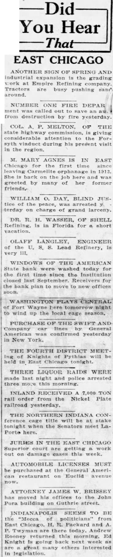 INDIANAPOLIS SEEMS TO BE the "Mecca politicians" from East Chicago. H. R. Packard and A. P. Twyman there today. Andrew Rooney returned this morning, Ed Knight Is going back next as great many others interested in legislation.