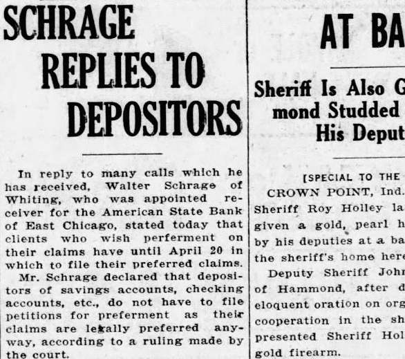 In to many calls which he reply [SPECIAL TO THE TIMES) received, Walter Schrage of CROWN POINT, Ind., March Whiting, appointed Sheriff Roy Holley last ceiver American State Bank of East Chicago, stated today that given gold, pearl clients who perferment by deputies their claims have until April 20 the sheriff's home which file their preferred claims. Deputy Sheriff John Mr. Schrage declared that deposiof accounts, checking of Hammond, after tors savings accounts, to oration eloquent petitions preferment their cooperation in the claims anypresented Sheriff way, to ruling made by the court. gold firearm.