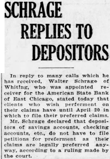 In reply many calls which he Walter Schrage Whiting, appointed receiver for the American State Bank of East Chicago, stated today that clients on their claims have April 20 in their claims. Mr. that deposiof savings checking accounts, do not to file petitions for their claims anyruling made by the court.