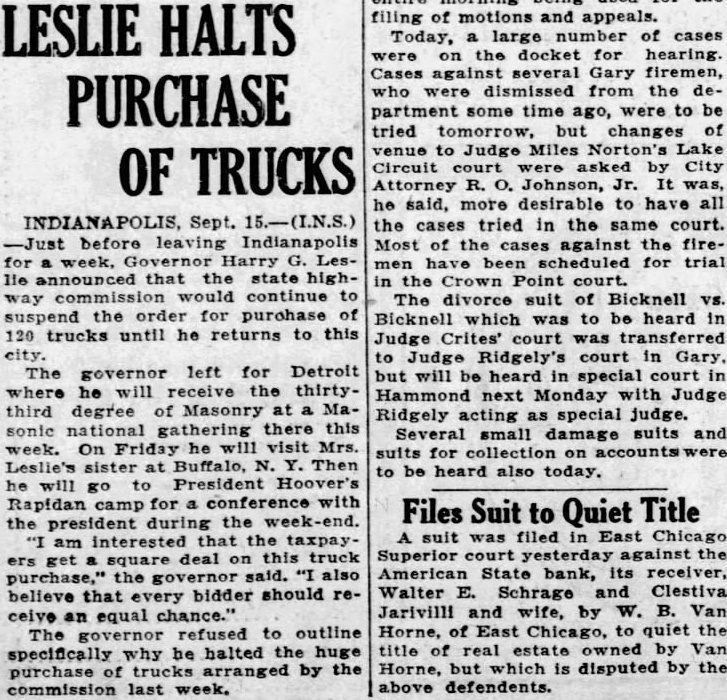 Sept. the cases tried in the same court. before Most of the cases against the fireLes- trial that high- Crown continue divorce suit of Bicknell The suspend the order for purchase Bicknell to be heard 120 trucks until he returns to this Judge Crites' court transferred Ridgely's court in Gary. The governor left for Detroit but will heard special court where receive thirtyHammond next Monday Judge degree Masonry Ridgely acting special judge. sonic national gathering there this damage suits and Several small On visit Mrs. for collection Then to be heard also today. President Files Suit to Quiet Title the president was filed East interested the taxpaythis truck Superior the said. also American State bank, its receiver, bidder should re- Walter Schrage and Clestiva believe that every Jarivilli and wife, by W. Van equal chance." refused to outline Horne, East Chicago, to quiet the governor why be halted the huge title of real estate owned by specifically arranged by the Horne, which disputed by commission last above defendents.