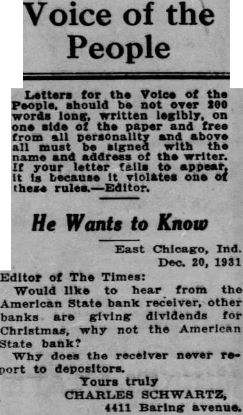 Editor of The Times: Would like to hear from the American State bank receiver, other banks are giving dividends for Christmas, why not the American State bank? Why does the receiver never report to depositors. Yours truly CHARLES SCHWARTZ, 4411 Baring avenue.