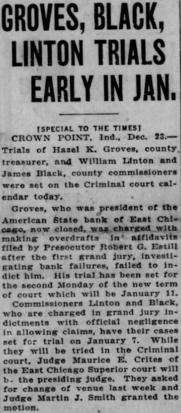 [SPECIAL TO THE TIMES) Trials of Hazel K. county treasurer, William Linton and James Black, county commissioners were set on the Criminal court calendar today. Groves, president of the American State cago, closed, was charged overdrafts affidavits filed by Presocutor Robert Estill after first grand jury, investigating bank failures, failed to dict been the second Monday the new court which be January 11. Linton and are jury inin have their cases set While tried the Criminal Maurice Crites the East Chicago court will the judge. They asked for venue week and Judge Martin Smith granted the motion.