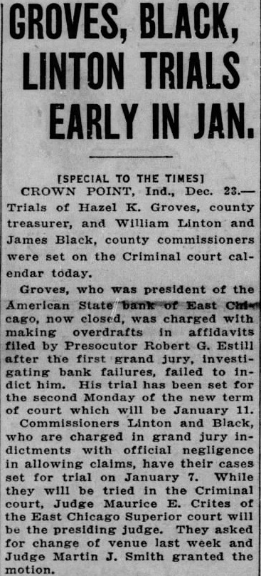 [SPECIAL TO THE TIMES) CROWN POINT. Ind., Dec. 23.Trials of Hazel K. Groves, county treasurer, William Linton and James Black, county on the Criminal court calwere endar today. Groves, was president of the American State bank of East Chiclosed, charged overdrafts in affidavits filed by G. Estill after grand jury, failed diet His the second which be 11. court Black, who charged in grand jury indictments with official negligence have their cases trial January While they tried the Criminal court, Judge Maurice E. Crites the East Chicago Superior will presiding judge. They asked for Martin J. Smith granted the Judge motion.