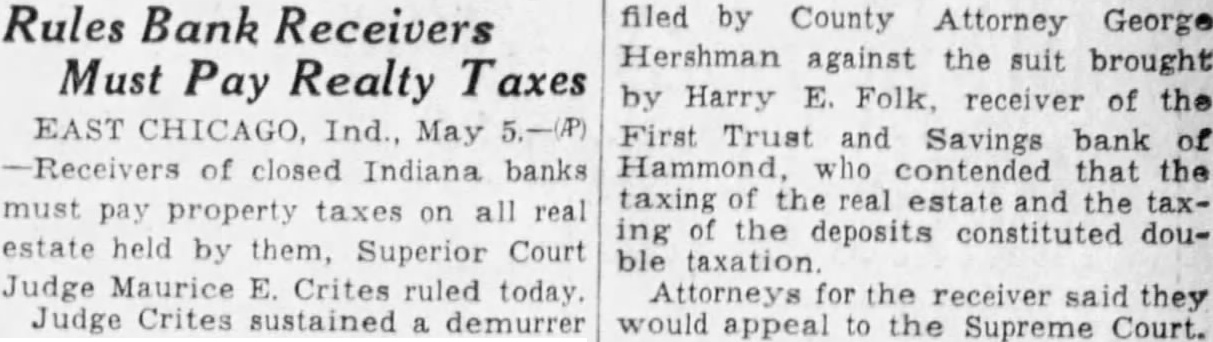 Rules Bank Receivers Must Pay Realty Taxes EAST Ind., May of closed Indiana banks real by Court Judge Maurice E. Crites Judge Crites sustained demurrer filed by County Attorney George Hershman against the suit brought by receiver of the First Trust and Savings bank that the of of the deposits constituted double taxation the they to the Court.