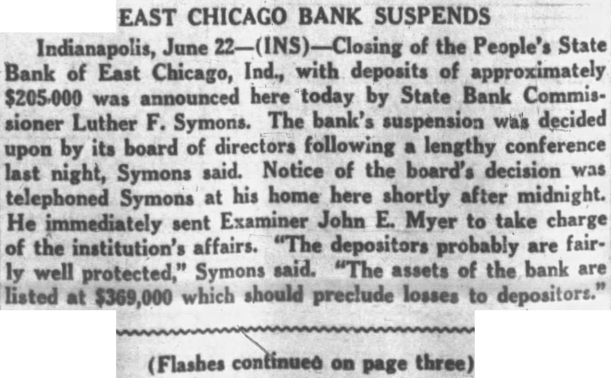 EAST CHICAGO BANK SUSPENDS Indianapolis, June 22-(INS)-Closing of the People's State Bank of East Chicago, Ind., with deposits of approximately $205.000 was announced here today by State Bank Commissioner Luther F. Symons. The bank's suspension was decided upon by its board of directors following a lengthy conference last night, Symons said. Notice of the board's decision was telephoned Symons at his home here shortly after midnight. He immediately sent Examiner John E. Myer to take charge of the institution's affairs. "The depositors probably are fairly well protected," Symons said. "The assets of the bank are listed at $369,000 which should preclude losses to depositors.' (Flashes continued on page three)