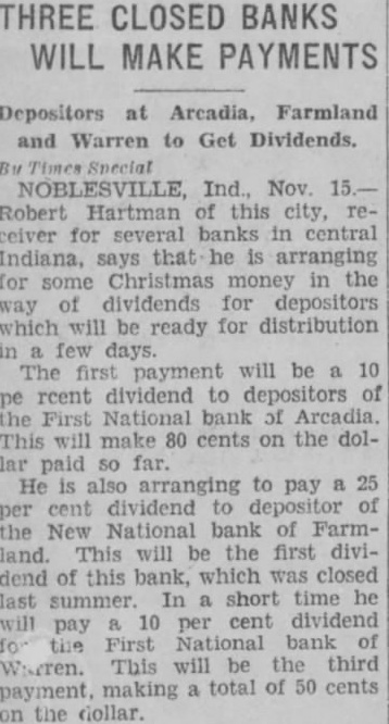 THREE CLOSED BANKS WILL MAKE PAYMENTS Depositors at Arcadia, Farmland and Warren to Get Dividends. Bu Times Special NOBLESVILLE, Ind., Nov. 15.Robert Hartman of this city, receiver for several banks in central Indiana, says that he is arranging for some Christmas money in the way of dividends for depositors which will be ready for distribution in a few days. The first payment will be a 10 pe rcent dividend to depositors of the First National bank of Arcadia. This will make 80 cents on the dollar paid so far. He is also arranging to pay a 25 per cent dividend to depositor of the New National bank of Farmland. This will be the first dividend of this bank, which was closed last summer. In a short time he will pay a 10 per cent dividend 10 the First National bank of Warren. This will be the third payment, making a total of 50 cents on the dollar.