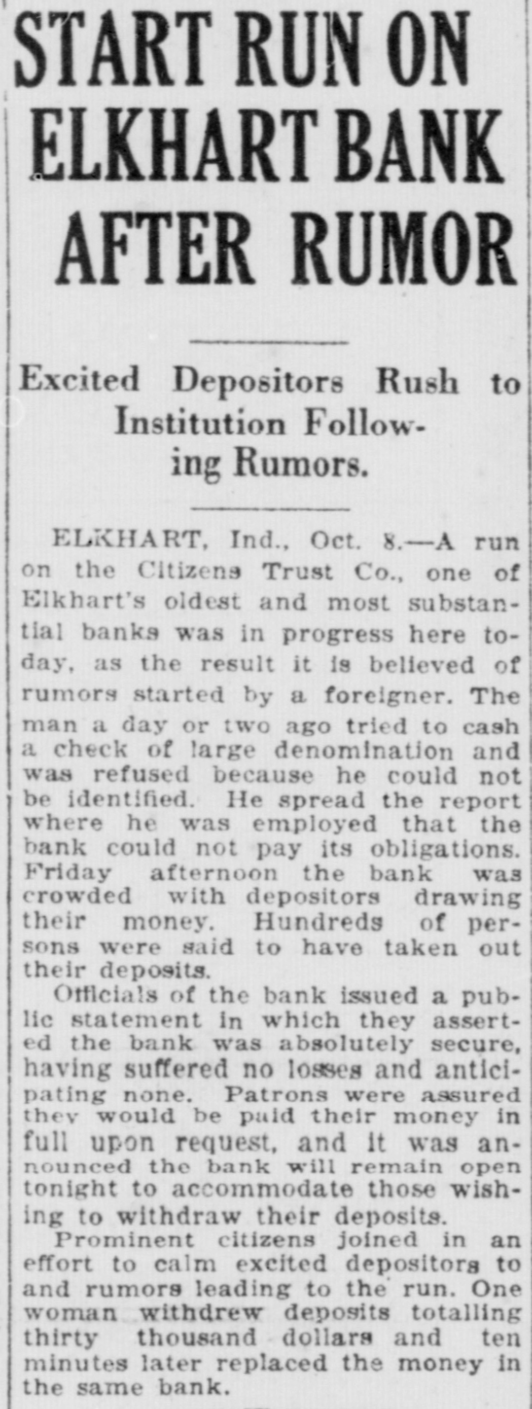 START RUN ON ELKHART BANK AFTER RUMOR Excited Depositors Rush to Institution Following Rumors. ELKHART, Ind., Oct. 8.-A run on the Citizens Trust Co., one of Elkhart's oldest and most substantial banks was in progress here today, as the result it is believed of rumors started by a foreigner. The man a day or two ago tried to cash a check of large denomination and was refused because he could not be identified. He spread the report where he was employed that the bank could not pay its obligations. Friday afternoon the bank was crowded with depositors drawing their money. Hundreds of persons were said to have taken out their deposits. Officials of the bank issued a public statement in which they asserted the bank was absolutely secure, having suffered no losses and anticipating none. Patrons were assured they would be paid their money in full upon request, and it was announced the bank will remain open tonight to accommodate those wishing to withdraw their deposits. Prominent citizens joined in an effort to calm excited depositors to and rumors leading to the run. One woman withdrew deposits totalling thirty thousand dollars and ten minutes later replaced the money in the same bank.