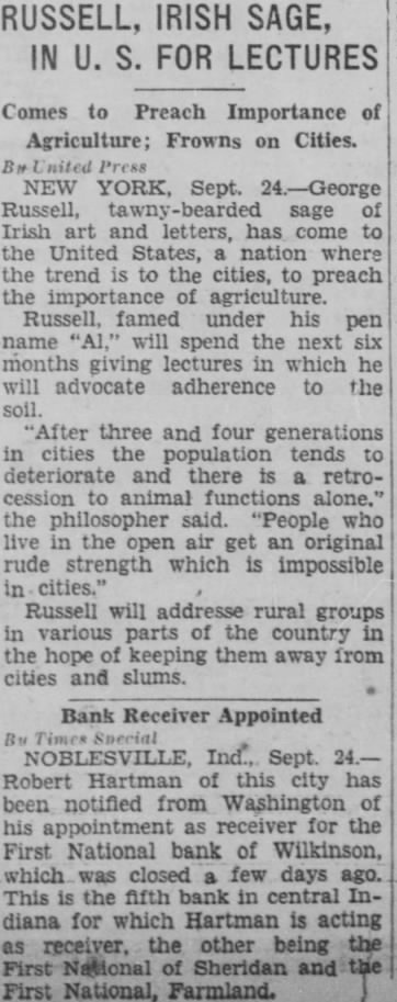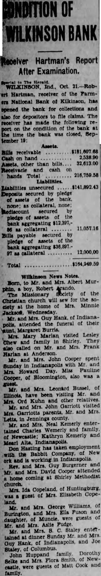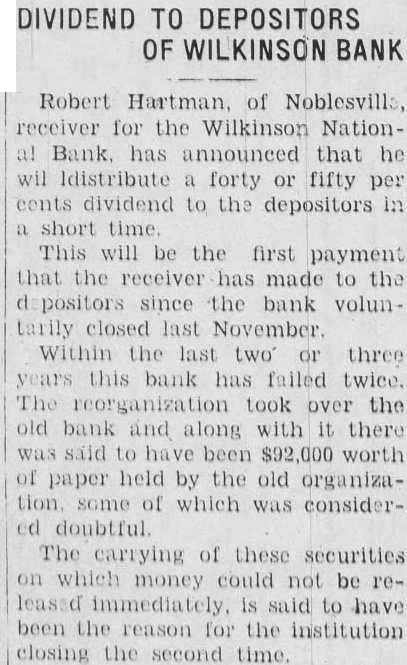Receiver Named for Bank Robert G. Hartman of Noblesville, been appointed receiver for the Wilkinson Farmers National Bank. which voluntarily closed its doors last Thursday Since the bank was closed a week no statement has been made as to whether depositors will be paid in full However, reports from outside sources indicate that the institution will be able to meet most, if not all, of its obligations Harry Fuller, Federal bank exam iner. was at the bank Thursday and remained there until Hartman was appointed receiver Steady withdrawals of deposits during the past week is believed to have been responsible for the bank's suspension of operation It is also said that much of the bank's money was tied up in real estate and other securities Action on the part of bank officials in closing the institution came as a most Hancock county people The bank was established in November 21, 1908, and has been serv ing the agricultural community of Wilkinson for nearly a quarter of a century The bank was capitalized at $25,000 surplus was $32,400 loans and discounts, $197,710 The deposits as shown by the June statement amount $195,170. Officers of the bank at the time the June statement was made W Sowerwine, president D. M Cooper vice president and S. Staley, cashier Robert Spencer of Marion, as well as numerous Wilkinson citizens were interested in the institu tion There are several other banks in the part of the which serving the Wilkinson community during the period of suspension of the Wilkinson bank