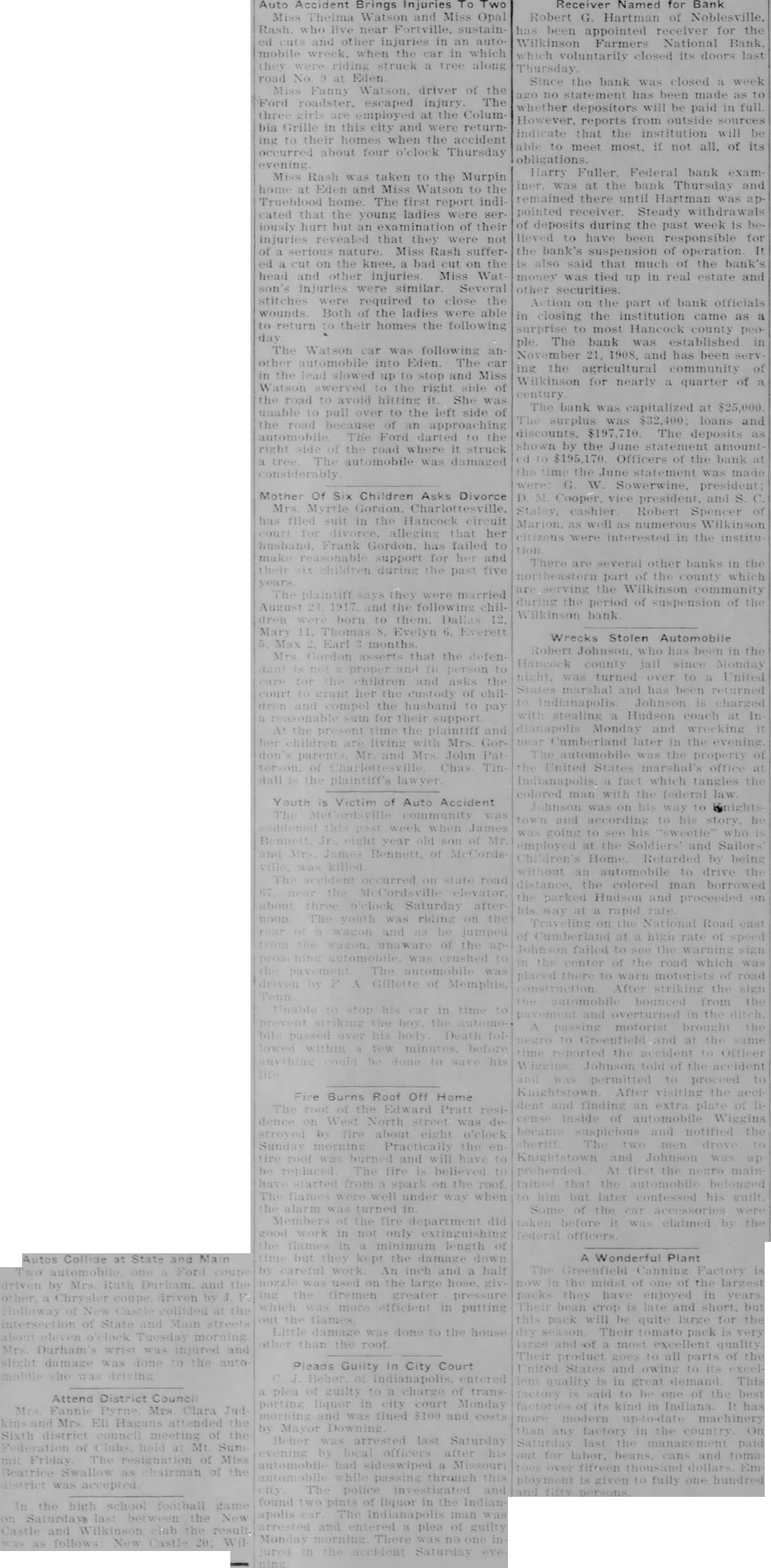 Auto Accident Brings Injuries To Two Miss Thelma Watson and Miss Opal Rash. who live near sustained and other injuries in an automobile wreck. when the car in which they were riding struck a tree along road No. at Eden Fanny Watson, driver of the Ford roadster, escaped injury The three employed at the Columbia Grille in this city and were returning to their homes when the accident occurred about four o'clock Thursday evening Miss Rash was taken to the Murpin home at Eden and Miss Watson to the Trueblood home. The first report indicated that the young ladies were ser iously hurt but an examination of their injuries revealed that they were not of a serious nature. Miss Rash suffered cut on the knee, bad cut on the head and other injuries Miss Wat son's injuries were similar Several stitches were required to close the wounds. Both of the ladies were able to return to their homes the following day