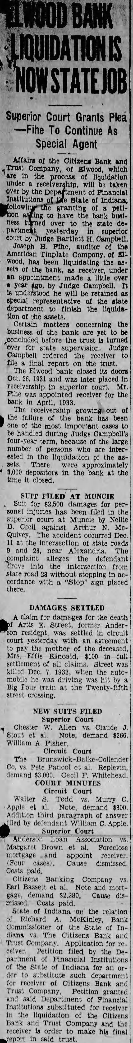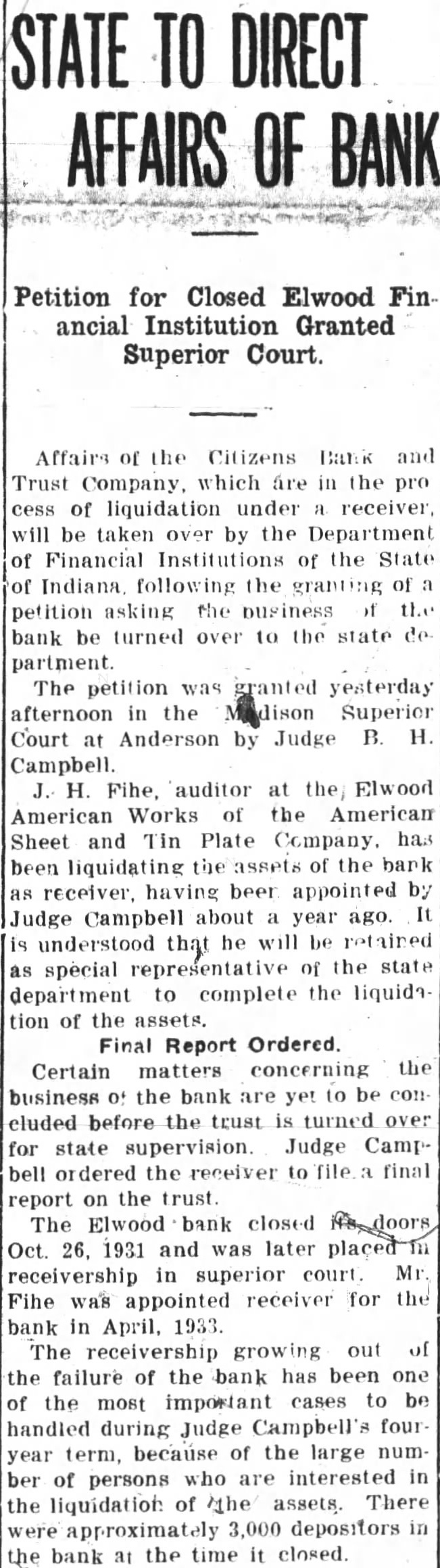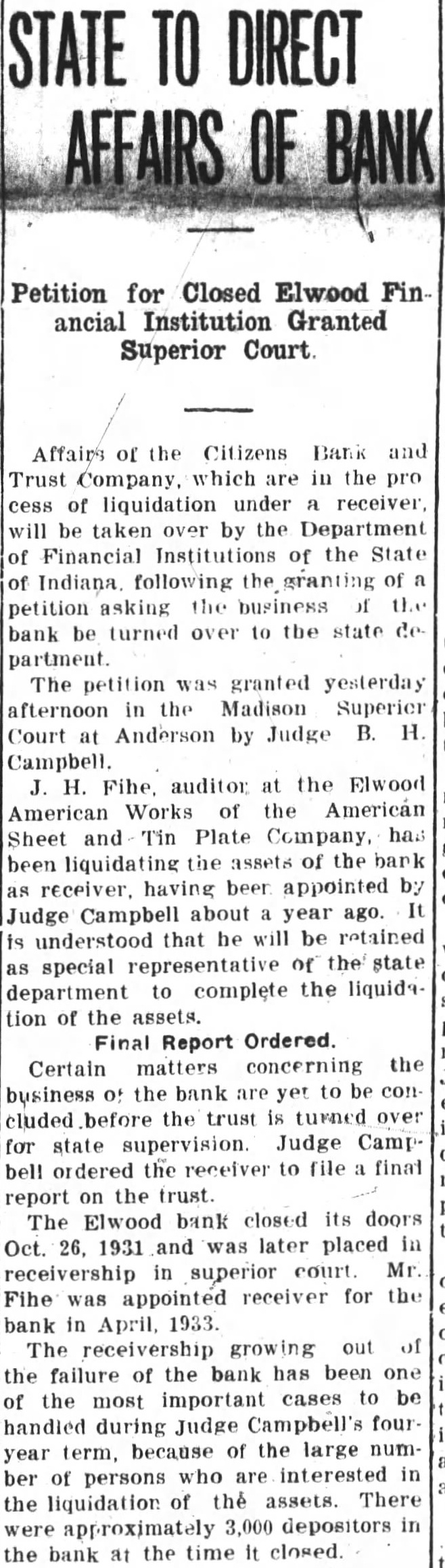 STATE TO DIRECT AFFAIRS OF BANK Petition for Closed Elwood Fin ancial Institution Granted Superior Court Affairs of the Citizens Bank and Trust Company, which are in the pro cess of liquidation under receiver, will be taken over by the Department of Financial Institutions of the State of Indiana following granting of petition asking the business of the bank be turned over to the state de partment The petition was granted yesterday afternoon in the Madison Superier Court at Anderson by Judge B. H. Campbell. Fihe, auditor at the Elwood American Works of the American Sheet and Tin Plate Company, has been liquidating the assets of the bank as receiver. having beer appointed by It Judge Campbell about year ago. is understood that he will be retained as special representative of the state department to complete the liquida tion of the assets. Final Report Ordered. Certain matters concerning the business the bank are yet to concluded before trust is turned over for state supervision. Judge Campbell ordered the receiver to file final report the trust. The Elwood bank closed its doors Oct. 26, 1931 and was later placed in receivership in superior court. Mr. Fihe was appointed receiver for the bank in April, 1933. The receivership growing out of the failure of the bank has been one of the most important cases to be handled during Judge Campbell's four year term, because of the large number of persons who are interested in the liquidation of the assets. There approximately 3,000 depositors in the bank at the time It closed.
