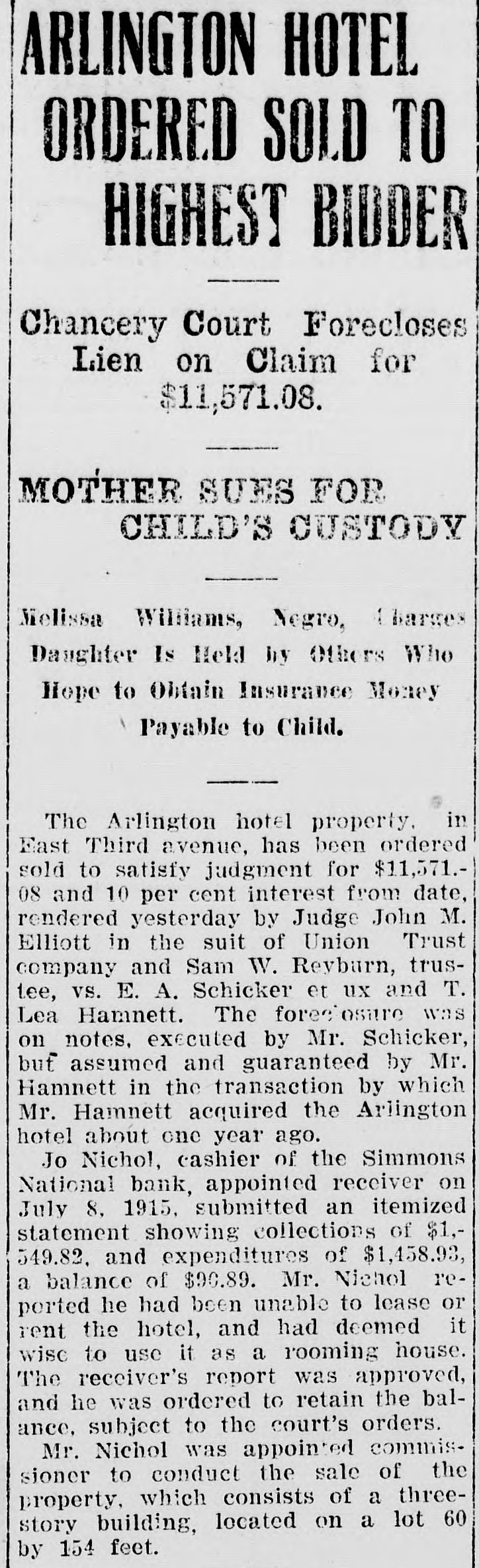 ARLINGTON HOTEL ORDERED SOLD TO HIGHEST BIDDER Chancery Court Forecloses Lien on Claim for $11,571.08. MOTHER SUES FOR CHILD'S CUSTODY Melissa Williams, Negro, Charges Daughter Is Held by Others Who Hope to Obtain Insurance Money Payable to Child. The Arlington hotel property. in East Third avenue, has been ordered sold to satisfy judgment for $11,571.08 and 10 per cent interest from date, rendered yesterday by Judge John M. Elliott in the suit of Union Trust company and Sam W. Revburn, trustee, vs. E. A. Schicker et ux and T. Lea Hamnett. The foreciosare was on notes, executed by Mr. Schicker, but assumed and guaranteed by Mr. Hamnett in the transaction by which Mr. Hamnett acquired the Arlington hotel about one year ago. Jo Nichol, cashier of the Simmons National bank, appointed receiver on July 8, 1915, submitted an itemized statement showing collections of $1,549.82. and expenditures of $1,458.93, a balance of $90.89. Mr. Nichol reported he had been unable to lease or rent the hotel, and had deemed it wisc to use it as a rooming house. The receiver's report was approved, and he was ordered to retain the balance, subject to the court's orders. Mr. Nichol was appointed commissioner to conduct the sale of the property, which consists of a threestory building, located on a lot 60 by 154 feet.