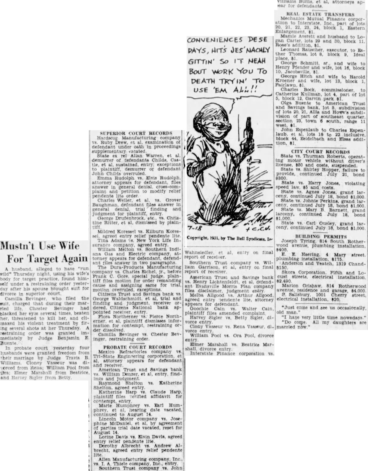 Mustn't Use Wife For Target Again The Dura Product husband, alleged to have "run vs. Charles before wild" Thursday night, using his wife's Frank special body for target found himtiff files motion order remanding self under order yestercause and assigning same for trial. day after his spouse brought suit for divorce superior court. Citizens Trust and Savings bank VS Camilla Bevinger who filed the George Waldschmidt et al. trial and charged that during their mar- finding and judgment receiver Chester Bevinger had dered Citizens National bank appointed receiver blacked her eyes times, beaten Flora Northerner Pierce Northto kill her, and erner al, plaintiff dismisses inforhis violent treatment by firmation for contempt, restraining oring several shots at her Thursday der dissolv restraining order granted Camilla Bevinger Chester Bev mediately by Judge Benjamin E. inger, restraining order Buente In probate court yesterday four PROBATE COURT RECORDS Mexico Refractories company granted freedom from Tri-State Engineering corporation their by Judge Travis attorney appears for defendant Cloney Vasseur was and receiver worced from Rena: William Pool from American Trust and Savings bank Elmer Marshall from Beatrice. and Harvey Sigler from Betty. ings and judgment vs. Ruby Drew. examination defendant under oath in proceedings supplementary vacated State Allan demurrer of defendants Childs, Castle, sustained. entry exceptions plaintiff demurrer of defendant John Childs Emma Rudolph vs. Elvis Rudolph attorney appears for files answer general denial complaint and petition to modify relief pendente order Baughman files answer in general denial, trial finding and judgment for plaintiff entry George etc., Christine Ritter, et al, dismissed by plainMildred Koressel V8. Kilburn Kores agreed entry relief pendente Tina Adams VS. New York Life Insurance agreed entry William Melton vs. Southern Indiana Gas and Electric company, attorney appears for defendant answer in two paragraphs Raymond Shelton Katherine Harp Claude Harp. plaintiff files affidavit for entry Marie Humphrey vs. Earl Humet hearing vacated, continued August phine et by agreement parties trial date vacated. reset for August Lorine VS. Elvin Davis, agreed entry relief pendente Dorothy Albrecht Andrew brecht, agreed entry relief pendente lite Allen Manufacturing company. Inc. Thiele entry Southern Trust company vs. John DAYS, HITS NACHLY GITTIN' so IT NEAH BOUT WORK You To DEATH TRYIN' TO USE 'EM ALL!! Wahnsiedler on final report of Southern Trust company William al, entry on final report of American Trust and Savings bank Henry et defendant Evansville Morris Plan company files disclaimer judgment Melba Allgood Arthur Allgood agreed entry pendente lite, attorney appears for Goochie Cain Walter Cain plaintiff files vorce entry Clony Vasseur Rena vorce entry William Pool V8. Ora Pool, divorce Elmer Marshall vs. Beatrice Mar shall divorce entry Interstate Finance corporation pear for REAL ESTATE TRANSFERS Mutual Finance corporInc., part lots Mamie Averett and husband to Carter lots 29 and 30, block 11. Leonard executor. to Es. ther Thomas, lot block 9, Ideal George Schmitt and wife to Henry Pfender and wife, lot 16, block 81 George Hitch and wife to Harold Kroener and wife, lot 13, block Charles to Catherine lot part of lot block Garvin park Olga Buente to American Trust and Savings lot of lots 20. 21. Allis and Howe's subdivision part southeast quarter section 23. town south. range 11 John Espenlaub to Charles Espen to block 44, Eeidelbach and Elsas inclusive addi- CITY COURT RECORDS State Thurman operating motor vehicle without driver's State VS. Shirley Hopper, failure to provide, continued July 21, bond State VS. Harry Jones, violating speed law, and costs. State Agnes grand larceny, continued July 18. bond $1,000 State VS. Mary Barnett grand larceny, continued July 18, bond ceny, continued July 18, bond $1,000 BUILDING PERMITS Joseph 814 South Rotherwood $400. avenue, plumbing installation plumbing Anderson and Veatch, 1319 ChandSkora Corporation. Fifth and Lo cust streets installation 82 Marion Grishaw. 814 garage 'Just come and see us occasionally old have very little time nowadays. "Do come. All my daughters are married now