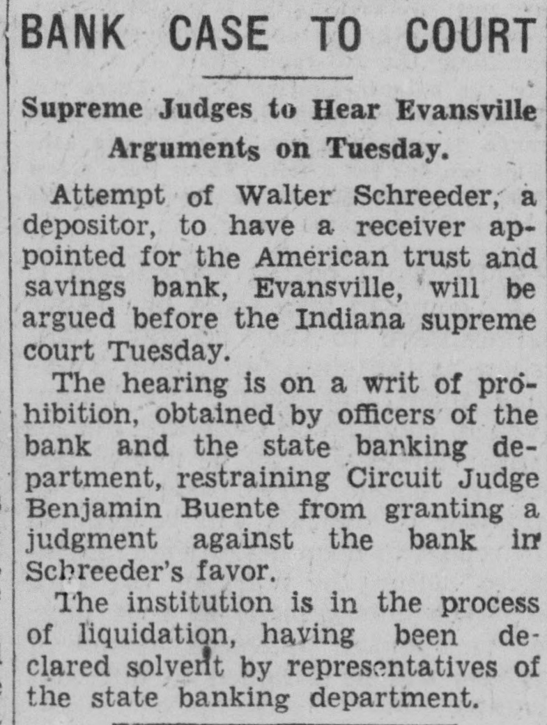 BANK CASE TO COURT Supreme Judges to Hear Evansville Arguments on Tuesday. Attempt of Walter Schreeder, a depositor, to have a receiver appointed for the American trust and savings bank, Evansville, will be argued before the Indiana supreme court Tuesday. The hearing is on a writ of prohibition, obtained by officers of the bank and the state banking department, restraining Circuit Judge Benjamin Buente from granting a judgment against the bank in Schreeder's favor. The institution is in the process of liquidation, having been declared solvent by representatives of the state banking department.