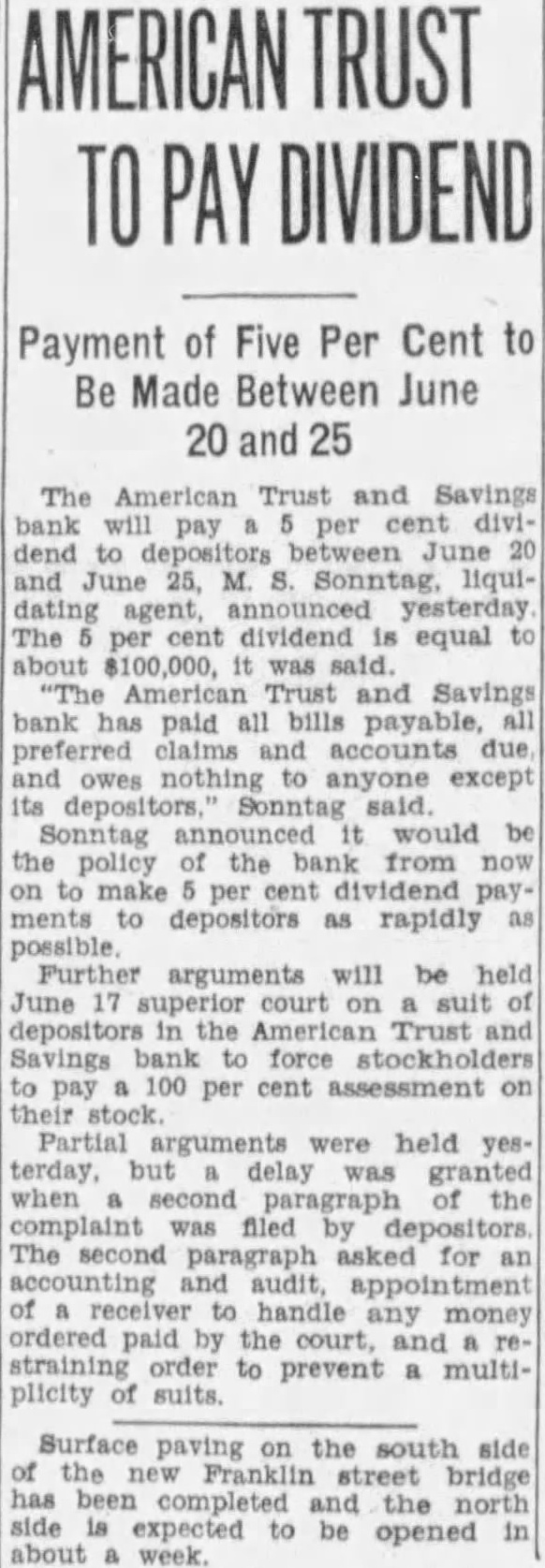 AMERICAN TRUST DIVIDEND Payment of Five Per Cent to Be Made Between June 20 and 25 The American Trust and Savings bank will cent to June and June 25, M. liquiThe dividend equal American Trust and Savings bank paid all bills payable, claims and accounts due and owes nothing to anyone except its Sonntag would the policy of the now to ments depositors as rapidly possible Further arguments will be held June court on suit depositors the American Trust and Savings force stockholders to pay 100 per cent assessment held yesdelay when paragraph complaint depositors. The second paragraph asked for and audit, appointment of receiver handle money ordered paid by the court, and to prevent multiplicity of suits. Surface paving the south side new Franklin street bridge has completed the north expected to be opened about week.