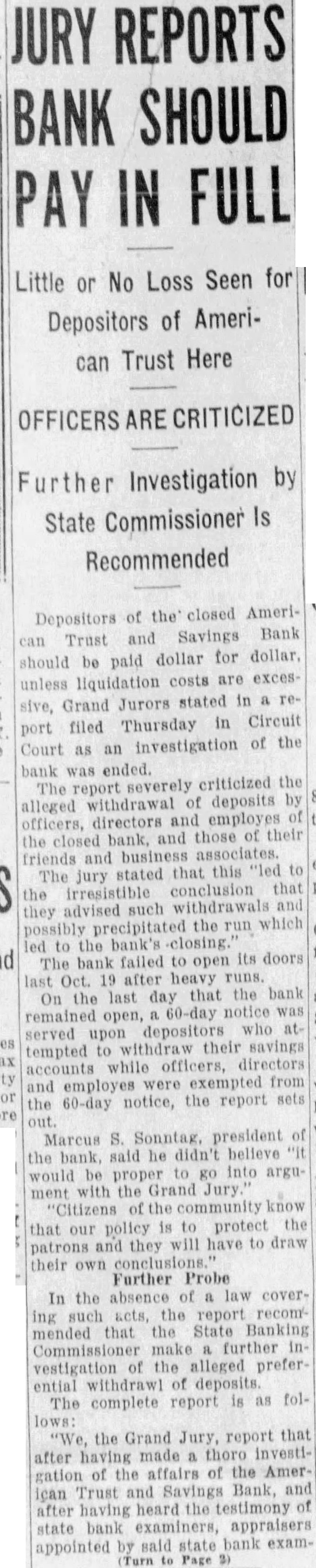 JURY REPORTS BANK SHOULD PAY IN FULL Loss Seen for Little or No Depositors of American Trust Here OFFICERS ARE CRITICIZED Further Investigation by State Commissioner Is Recommended Depositors of the closed AmeriSavings Bank Trust and dollar for should be paid unless liquidation costs are exces Grand Jurors stated in Circuit filed Thursday port of the investigation Court as ended. criticized the by withdrawal of deposits alleged directors and employes officers, those of their the closed bank, and business associates. friends and stated that this The jury conclusion that such withdrawals advised the which possibly precipitated run the bank's closing. The bank failed to its doors Oct. after heavy runs. On the last day that the bank remained 60-day notice open, served attempted withdraw their savings while directors from and notice, the report sets the Marcus Sonntag, president the bank, didn't believe be proper to into arguwith know policy to protect the will have draw they their own Further Probe In the absence of law coversuch the report recomacts, that the State Banking mended Commissioner make further investigation the alleged prefer withdrawl deposits. The complete report is as the Grand Jury, report that after made thoro investithe affairs the Amercan Trust and Savings Bank, and the state bank appraisers said state bank appointed Page