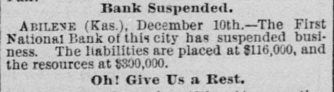 Bank Suspended. ABILENE (Kas.), December 10th.-The First National Bank of this city has suspended business. The liabilities are placed at $116,000, and the resources at $300,000. Oh! Give Us a Rest.