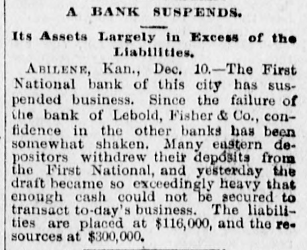 Fisher was enough for this year, but today brought forth another failure of a similar character which, coming as it does SO soon after the former, will add considerably to the load of the city's misfortune. It is never a pleasure to a newspaper to tell of a business reverse and the REFLECTOR relates the story of today's failure with as much reluctancy as though it had a personal interest in the unfortunate corporation's downfall. THE FIRST NATIONAL'S CLOSE. Those who called at the cashier's window of the First National bank this morning up to 11 o'clock found everything all right, and business was transacted as usual. At that hour the doors were closed, a statement of the bank's standing made out and the institution turned over to the comptroller of the United States currency according to provisions made by law for such occasions. A statement posted on the door informed all, over the signature of the president, J. E. Bonebrake, that owing to the impossibility of securing cash for the transaction of business the doors had been closed, and assuring the public that all depositors would be paid in full. There was little excitement manifested during the afternoon, as all interested seemed to take the matter philosophically and be convinced that their interests would not suffer, altnough they might be inconvenienced for a time by the closing. This is probably the correct view, as it is beyond question that the bank's affairs will be eventually straightened out to the depositors' satisfaction. DRAGGED DOWN. At the last quarterly statement, Oct. 1st, the bank's resources were shown to be $256,064.57. The liabilities including capital stock were about $200,000 leaving a surplus fund of $17,600 and undivided profits of $4,661. The bank was doing a good business, enjoyed an extensive line of discounts and the confidence of the eastern stockholders. But on Oct. 28th came the failure of the Abilene Bank of Lebold, Fisher & Co., with all the widespread notoriety and panicky feeling attendant on such a happening. Every busiuess house in the city felt the stroke, the banks in particular and the First National more especially. The eastern correspondents who had been favoring the bank with their patronage began to get slightly nervous and one by one the certificates of deposit were sent in and the cash surplus diminished. Then valuable lines of discounts which had been given good returns were gradually tapered off and the cash on paper held was demanded. Altogether the drain upon an institution already weakened by the downfall of its neighbor was too much and as the re-discounts could not bei realized upon and accommodations could not be secured from loaners, owing to the uneasiness felt on account of the other bank's closure, it was a foregone conclusion that the crash must come. The fact of carrying considerable paper taken in flush times and now much depreciated was also a factor in the matter. The assets at the shutting of the doors this morning were $238,492.67 and the liabilities, including circulation, $116,254.59. The fact that much of the resources are made up of paper not negotiable at present and much that is only worth a small percentage of its face value caused the crisis. The depositors' claims amount to about $50,000 and will be met in full, as the stockholders are responsible for an amount equal in value to the stock held and in addition to the stock. THE ACTUAL LOSERS. The stockholders will be the ones who will feel the loss. The capital paid in is $100,000. divided into 1,000 shares. These are held by about 150 stockholders scattered all over the nation. Large blocks are held in Freeport, Ills.; Rochester, Victor and Canandaigua, New York; Madison, Ohio; Connecticut, Maine and Massachusetts. The Abilene holders are chiefly the officers and directors. The officers are J. E. Bonebrake, president; G. W. Hurd, vice-president; Harry .Hayes, cashier. OFFICERS NOT BLAMABLE. The officers of the bank have done all in their power to avert the disaster. They are not in any way blamable and could not carry the institution against the great odds which have during the past month been opposing it. On Mr. Harry Hayes, the cashier, the suspension is particularly hard. He has been indefatigable in bis efforts to build up the bank ever since his ac-