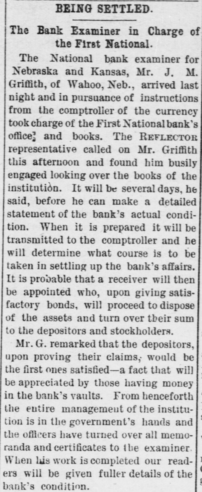 BEING SETTLED. The Bank Examiner in Charge of the First National. The National bank examiner for Nebraska and Kansas, Mr. J. M. Griffith, of Wahoo, Neb., arrived last night and in pursuance of instructions from the comptroller of the currency took charge of the First National bank's office; and books. The REFLECTOR representative called on Mr. Griffith this afternoon and found him busily engaged looking over the books of the institution. It will be several days, he said, before he can make a detailed statement of the bank's actual condition. When it is prepared it will be transmitted to the comptroller and he will determine what course is to be taken in settling up the bank's affairs. It is probable that a receiver will then be appointed who, upon giving satisfactory bonds, will proceed to dispose of the assets and turn over their sum to the depositors and stockholders. Mr. G. remarked that the depositors, upon proving their claims, would be the first ones satisfied-a fact that will be appreciated by those having money in the bank's vaults. From henceforth the entire management of the institution is in the government's hands and the officers have turned over all memoranda and certificates to the examiner. When his work is completed our readers will be given fuller details of the bank's condition.