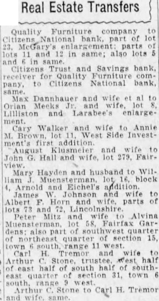 Real Estate Transfers Quality Furniture company National part of McGary's parts in same; also lots same. Citizens Trust and Savings bank receiver Quality comto Citizens National Max Dannhauer and al Orian and wife lot Lilliston and Larabee's enlargeCary Walker and wife Annie M. Brown Side InvestAugust Klusmeier and wife G. Hall and Mary Hayden and husband to Wil. block Arnold addition. James Johnson and wife Albert parts of lots Peter Mitz Alvina Fairfax northeast section 15, and wife half half south half quarter section 31, town to Carl H. Tremor