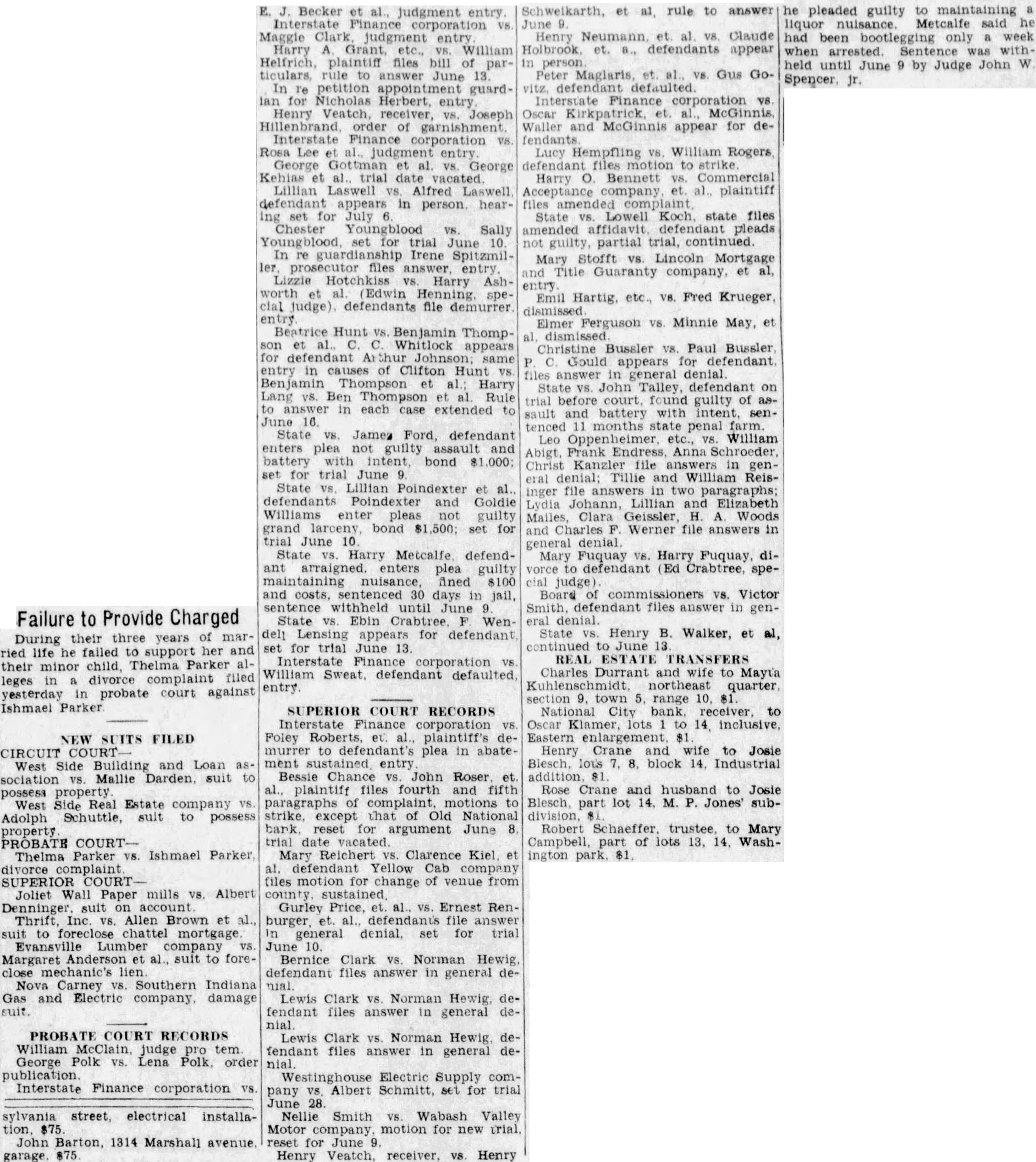 Failure to Provide Charged During their three years of married life he failed to support her and their minor child, Thelma Parker alleges in divorce filed yesterday in probate court against Ishmael Parker NEW ITS FILED CIRCUIT COURT West Side Building and Loan as- ment sociation Mallie Darden, suit to possess property West Side Real Estate company vs. Adolph Schuttle, suit to possess PROBATE COURT- trial date Thelma Parker vs. Ishmael Parker, divorce complaint SUPERIOR COURTJoliet Wall Paper mills VS. Albert Denninger suit on Thrift, Inc. VS. Allen Brown et al., suit foreclose chattel mortgage Evansville Lumber company vs. June 10. Margaret Anderson et al., suit to foreclose mechanic's lien Nova Carney VS. Southern Indiana Gas and Electric company. damage PROBATE COURT RECORDS William McClain. judge tem George Polk Lena order Interstate Finance corporation vs. sylvania street, electrical installaJohn Barton, 1314 Marshall avenue. E. J. Becker et al., judgment entry Finance corporation Maggie Clark judgment entry Harry A. etc., William Helfrich, plaintiff files bill of particulars, rule to answer June 13. In Te petition appointment guardian for Nicholas Herbert, entry Henry Veatch. receiver, Joseph Hillenbrand order of garnishment. Interstate Finance corporation vs. Rosa Lee et al., judgment entry George et al. vs. George Kehias et al., trial date vacated Lillian Laswell Alfred Laswell defendant appears in person. hearing set for July Chester Youngblood vs. Sally Youngblood, set for trial June 10 In re guardianship Irene Spitzmiller files answer entry Lizzie Hotchkiss vs. Harry Ashworth Edwin Henning. special judge) defendants file demurrer entry Beatrice Hunt vs. Benjamin Thompson et Whitlock appears for defendant same entry in causes of Clifton Hunt V8. Benjamin Thompson al.; Harry Lang Ben Thompson et al Rule to answer each case extended to June 16 State VS. James Ford, defendant enters plea not guilty assault and battery with intent bond $1,000: for trial June State vs. Lillian Poindexter et al. defendants Poindexter and Goldie Williams enter pleas guilty grand larceny bond $1,500; set for trial June 10 State Harry Metcalfe defendant arraigned. enters plea guilty maintaining nuisance, fined 8100 and costs, sentenced 30 days in jail, sentence withheld until June State Ebin Crabtree Wen deli Lensing appears for defendant set for trial June 13 Interstate Finance VS William Sweat. defendant defaulted SUPERIOR COURT RECORDS Interstate Finance corporation Foley Roberts, et. al., plaintiff's demurrer to defendant's plea in abateentry Bessie Chance vs. John Roser et. al. plaintiff files fourth and fifth paragraphs of complaint, motions to strike, except that of Old National bark reset for argument June 8. Mary Reichert Clarence Kiel. et al. defendant Yellow Cab files motion for change of venue from sustained Gurley Price, al., vs. Ernest Renburger. al., file answer In general denial, set for trial Bernice Clark VS. Norman Hewig, defendant files answer in general deLewis Clark VS. Norman Hewig defendant files answer in general deLewis Clark VS. Norman Hewig, defendant files answer in general denial Westinghouse Electric Supply company vs. Albert Schmitt, set for trial June Nellie Smith VS. Wabash Valley Motor company. motion for new trial reset for June Henry Veatch, receiver, vs. Henry Schweikarth, et al, rule to answer June Henry Neumann, et. al. V8. Claude Holbrook et. a., defendants appear in Peter Maglaris, et. al., VS. Gus GoInterstate Finance corporation V8 Waller and McGinnis appear for defendants Lucy Hempfling VS. William Rogers defendant files to strike Harry O. Bennett Commercial Acceptance company al., plaintiff files amended State Lowell Koch. state files amended affidavit defendant pleads not guilty, partial trial, continued. Mary Stofft VS. Lincoln Mortgage and Title Guaranty company, et al. entry Emil Hartig, etc., V8. Fred Krueger, dismissed Elmer Ferguson vs. Minnie May, et dismissed Christine Bussler V8. Paul Bussler Gould appears for defendant files answer general denial State John Talley. defendant on trial before court. found guilty of assault and battery with intent senmonths state penal farm. Leo Oppenheimer, etc. vs. William Abigt, Frank Endress Anna Schroeder, Christ Kanzler file answers in gendenial; Tillie and William Reisinger file answers in two paragraphs; Lydia Johann, Lillian and Elizabeth Mailes, Clara Geissler H. Woods and Charles Werner file answers in general denial Mary Fuquay VS. Harry Fuquay divorce to defendant (Ed Crabtree, spejudge) Board of commissioners VS. Victor Smith, defendant files answer in general denial State vs. Henry B. Walker, et al, continued June REAL ESTATE ANSFERS Charles Durrant and wife to Mayta northeast quarter section 9, town range 10, 81. National City bank, receiver, to Oscar Klamer, lots to 14, inclusive Eastern 81 Henry Crane and wife to Josie Blesch, lots 8, block 14. Industrial addition Rose Crane and husband to Josie Blesch, part lot 14. M. P. Jones' subRobert Schaeffer. trustee, to Mary Campbell, part of lots 13, 14, Washington park. $1 he pleaded guilty to maintaining liquor Metcalfe said had been bootlegging only week when arrested. was withheld until June 9 by Judge John W