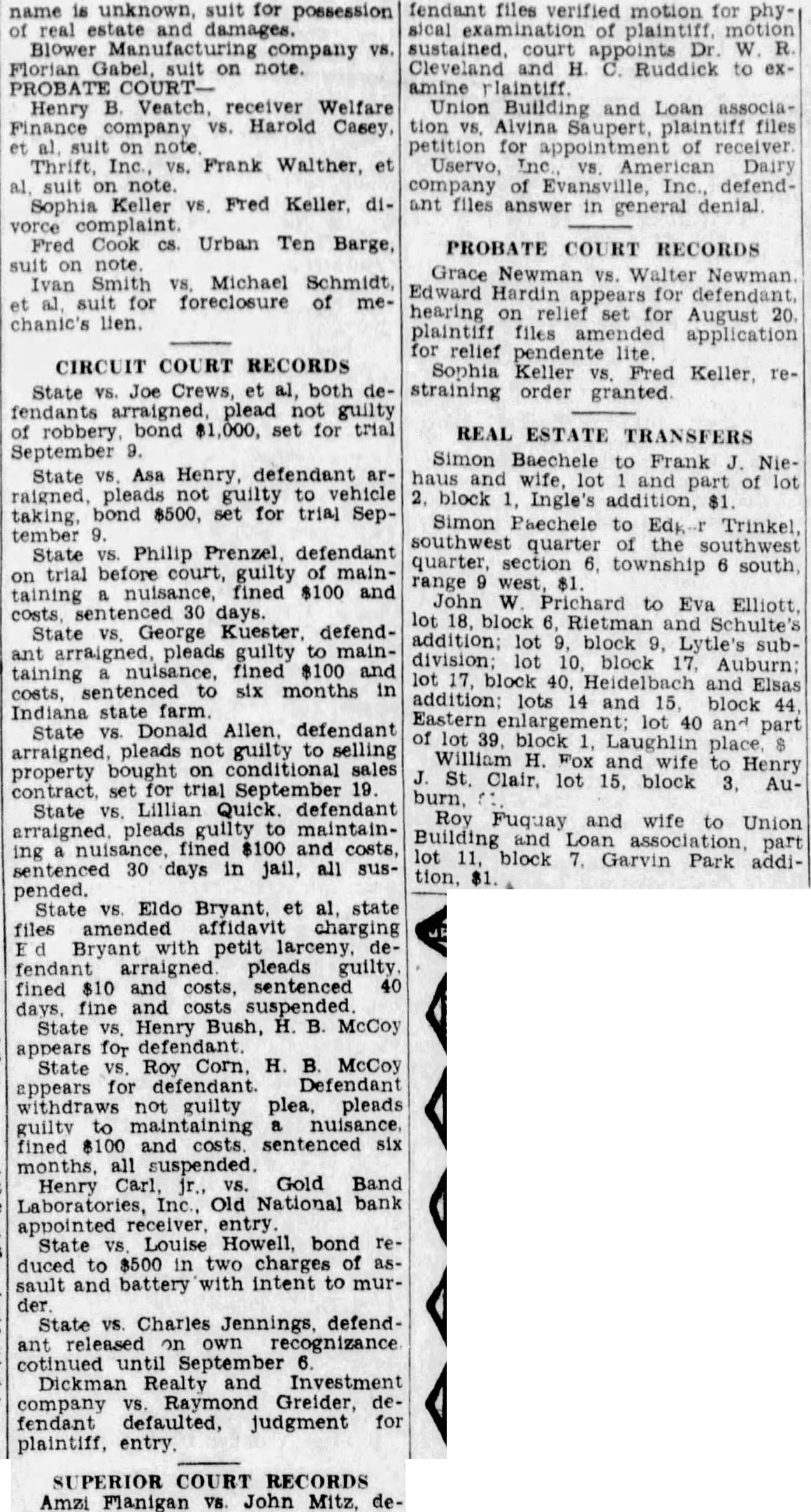name is unknown suit for possession of real estate and Blower company vs. Florian Gabel, suit on note. PROBATE COURTHenry Veatch, receiver Welfare Finance company VS. Harold Casey. et suit on note Frank Walther, et suit Sophia Keller VS. Fred Keller, dicomplaint Fred Cook CS. Urban Ten Barge, suit on note Ivan Smith Michael Schmidt suit for foreclosure of mechanic's lien. CIRCUIT COURT RECORDS State Crews, al, both defendants plead not guilty of robbery bond $1,000, set for trial September State Asa Henry, defendant arraigned guilty to vehicle bond 8500, set for trial September State vs. Philip Prenzel. defendant on trial before court, range taining nuisance, fined $100 and sentenced 30 days. State VS. George Kuester, defendant arraigned, guilty taining fined $100 and lot sentenced to six months in Indiana state farm State V8. Donald Allen, defendant arraigned pleads not guilty selling property bought conditional sales contract set trial September 19 State VS. Lillian Quick. defendant arraigned pleads to maintain$100 and costs, ing sentenced 30 days in jail, all sustion, pended. State VS. Eldo Bryant, et al. state files amended affidavit charging Ed Bryant with petit larceny depleads fined $10 and costs, sentenced 40 days, fine and costs suspended State Henry Bush, H. B. McCoy appears for State Roy H. B. McCoy appears for defendant Defendant withdraws not guilty plea, pleads guilty to maintaining nuisance fined $100 and costs. sentenced six all Henry Carl, Gold Band Laboratories, Inc., Old National bank appointed receiver, entry. State Louise bond duced to two charges of sault and battery with intent to mur der State vs. Charles Jennings defend ant recognizance cotinued September Dickman Realty and Investment Raymond fendant defaulted, judgment for plaintiff, entry SUPERIOR COURT RECORDS Amzi Flanigan VS. John Mitz. de- fendant files verified motion for phy-1 sical plaintiff sustained, court appoints Dr W Cleveland and H. Ruddick to examine Union Building and Loan association vs. Alvina Saupert, plaintiff files petition for appointment of receiver American Dairy company of Evansville, Inc. defendant files answer in general denial PROBATE COURT RECORDS Grace Newman Walter Newman Edward Hardin for defendant. hearing on relief set for August 20. plaintiff for relief files amended application pendente lite Sophia Keller Keller, restraining order granted REAL ESTATE TRANSFERS Simon Baechele to Frank Niehaus and lot part of lot block Ingle's addition, $1. Simon Paechele to Edk Trinkel southwest quarter of the southwest quarter, section township south west, John Prichard to Eva Elliott lot 18, block lot block Auburn: block Heidelbach and addition: lots 14 and 15 block 44 Eastern lot 40 and part of lot 39, block Laughlin place William H. Fox and wife to Henry St. Clair, lot 15, block AuRoy Fuquay and wife to Union Building Loan part lot 11, block Garvin Park addi-
