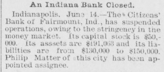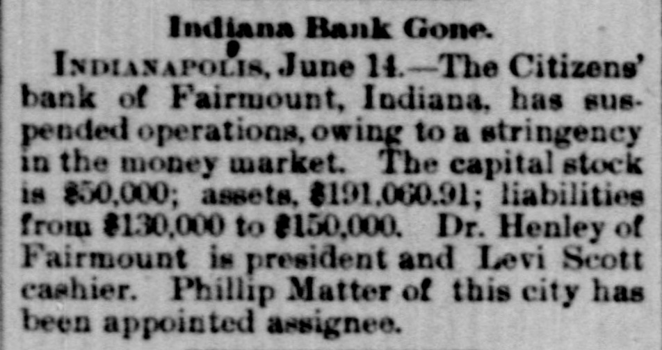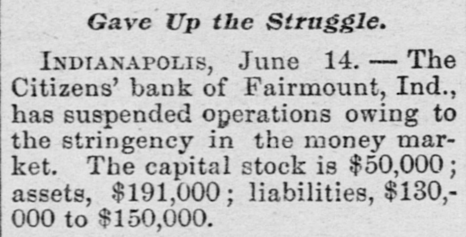FINANCIAL CRIPPLES. An Indiana Bank Suspends-Run on a Gotham Bank. INDI ANAPOLIS. June 14.-The Citi zens' bank, of Fairmount, Ind., has suspended operations owing to stringency in money markets. Capital stock, $50.000: assets, $101,000; liabilities, from $130.000 to $150,000. NEW YORK. June 14.-A run was started on the Irvings Savings Institution this morning as soon as the doors of the place at No. 96 Warren street were opened. Treasurer M. B. Latimer said the bank had on hand a million dollars and could get that much more if necessary, at a moment's notice. This is the bank in which Superintendent of Banks Preston, of the state of New York, discovered a deficiency of $70,800. Up to 2 o'clock $50.000 had been withdrawn by deposits from the institution. The paying teller was paying the depositors slowly. At 2 o'clock there were about a hundred depositors in line. The officials declare there is no cause for alarm, as the surplus exceeds the deficiency by over $600,000. PAINE. = LLE. O., June 14. - This morning the Lake county bank of Aaron, Wilcox & Co. posted a notice on its doors as follows: This bank has suspended temporarily, being unable to meet the run on it at present, owing to the stringency in the money market. All depositors will be paid in full." The personal estate of the stockholders is liable for the indebtedness, in all amounting to several hundred thousand dollars. The bank is believed to be solvent. It was organized twenty years ago, and has always been considered a sound institution. TOPEKA, Kan., June14.-State Bank Commissioner Briedenthal, who has recently made an examination into the affairs of the Bank of Burr Oak. which failed last Saturday, declares the man ager, Hurlbert, of the bank conducted its affairs in such a manner as to send him to the penitentiary. Hurlbert disappeared the day after the failure, leaving a wife and two children bebind, and cannot be found. Commissioner Breidenthal says Hurlbert has made false statements to the bank commissioner. The bank's deposits amount to $45,000. and, although the assets on their face show a value of $54,000, they are nearly worthless. and will net the depositors nearly 20 cents on the dollar. OMAHA, Neb., Jane 14.-The runs on the Omaha savings banks subsided this morning almost as quickly as they started yesterday. Early there were a few depositors at the Omaha Savings demanding their money, but as soon as it became apparent that the rush was over the anxious ones left without taking their cash. RIVERSIDE, Cal., June 14,-The doors of the Riverside Banking company failed to open at the usual hour today. The following sign was displayed on the door: "This bank is closed under instructions. Depositors will be paid." MOUNT VERNON, O., June 14. -The Chicago Brown Stone company. engaged in extensive quarrying in Knox county, has been placed in the hands of a receiver. Claims against the concern amount to $30,000. CLEVELAND, June 14.-The Baackes Wire Nail company has made an assignment. The inability to raise money to meet maturing paper was the sole cause of the failure. Liabilities of the company are only $225,000, and the assets reach $900,000. WESTON, June 14. - The Exchaneg Banking company. of this place, closed its doors this morning. The bank has had a run and was unable to get help, and the airectors decided it to the best interests to close. The directors have notified depositers that they will probably receive dollar for dollar.