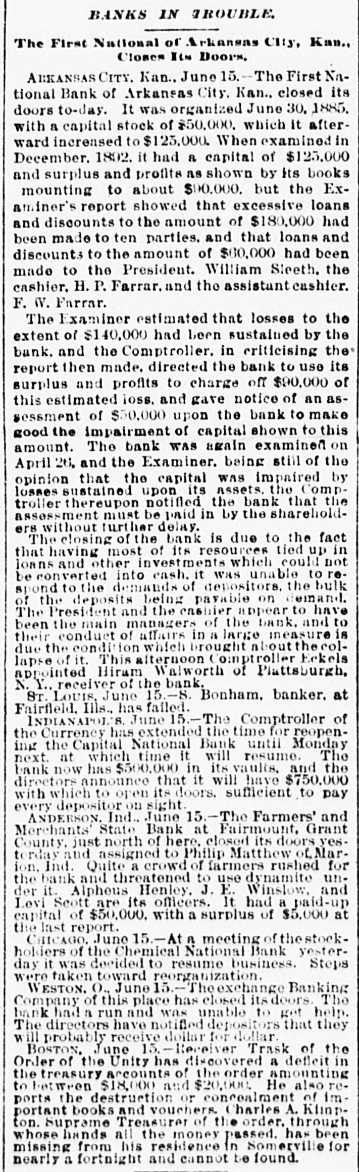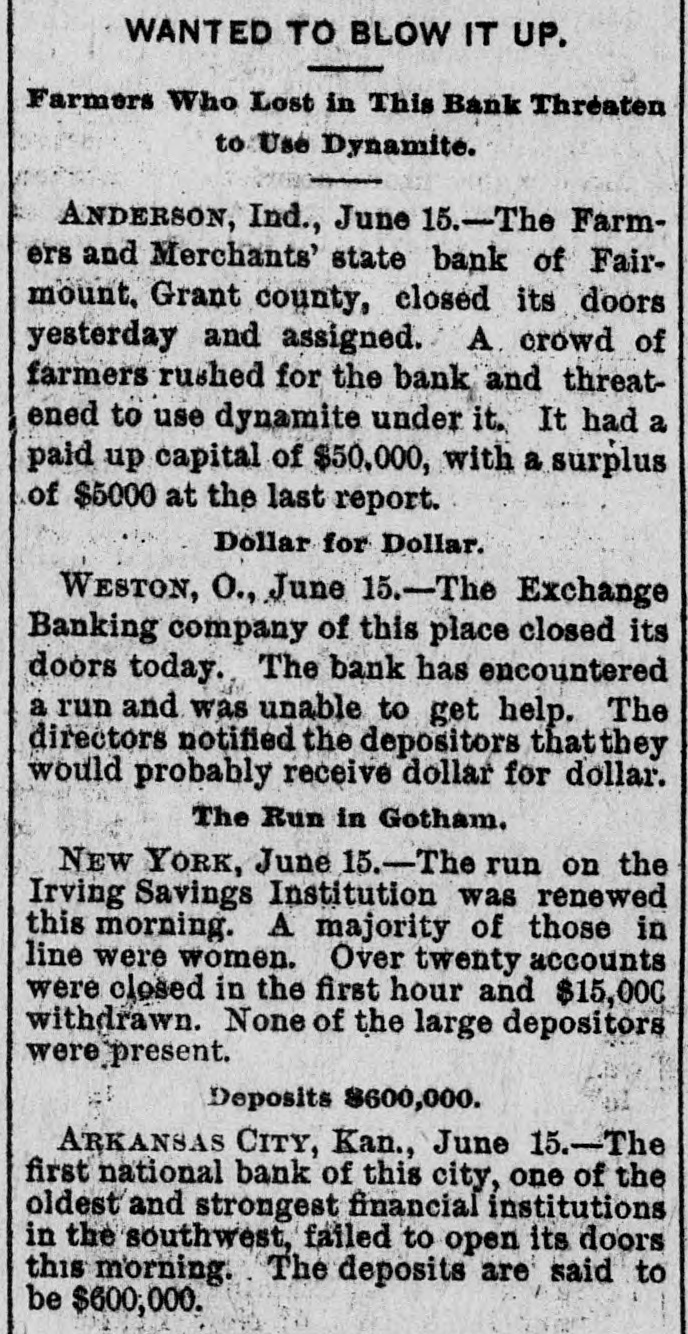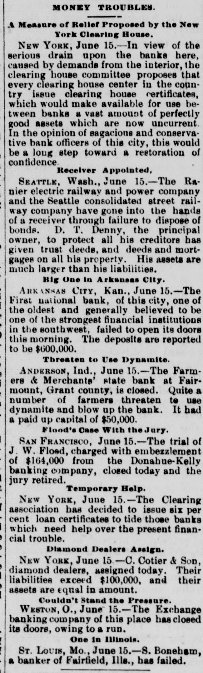 MONEY TROUBLES. Measure of Relief Proposed by the New York Clearing House. NEW YORK, June 15.-In view of the serious drain upon the banks here, caused by demands from the interior, the clearing house committee proposes that every clearing house center in the country issue clearing house certificates, which would make available for use between banks a vast amount of perfectly good assets which are now uncurrent. In the opinion of sagacious and conservative bank officers of this city, this would be a long step toward a reetoration of confidence. Receiver Appointed, SEATTLE, Wash., June 15.-The Ranier electric railway and power company and the Seattle consolidated street railof way a receiver company through have gone failure into to the dispose hands of bonds. D. T. Denny, the principal owner, to protect all his creditore has given trust deeds, and deeds and mortgages on all his property. His assets are much larger than his liabilities. Big One In Arkansas City. ARK ANSAS CITY, Kan., June 15.-The First national bank, of this city, one of the oldest and generally believed to be one of the strongest financial institutions in the southweet, failed to open its doors this morning. The deposits are reported to be $600,000. Threaten to Use Dynamite. ANDERSON, Ind., June 15.-The Farmers & Merchants' state bank at Fairmount, Grant county, is closed. Quite a number of farmers threaten to use dynamite and blow up the bank. It had a paid up capital of $50,000. Flood's Case With the Jury. SAN FRANCISCO, June 15.-The trial of J. W. Flood, charged with embezzlement of $164,000 from the Donabue-Kelly banking company, closed today and the jury retired. Temporary Help. NEW YORK, June 15.-The Clearing association has decided to issue six per cent loan certificates to tide those banks which need help over the present financial trouble. Dismond Dealers Assign. NEW YORK, June 5.-C. Cotier & Son, diamond dealers, assigned today. Their liabilities exceed $100,000, and their assets are equal in amount. Couldn't Stand the Pressure. WESTON, O., June 15.-The Exchange banking company of this place has closed its doors, owing to a run. One in Illinois. Sr. Louis, Mo., June 15.-S. Boneham, a banker of Fairfield, Ills., has failed.