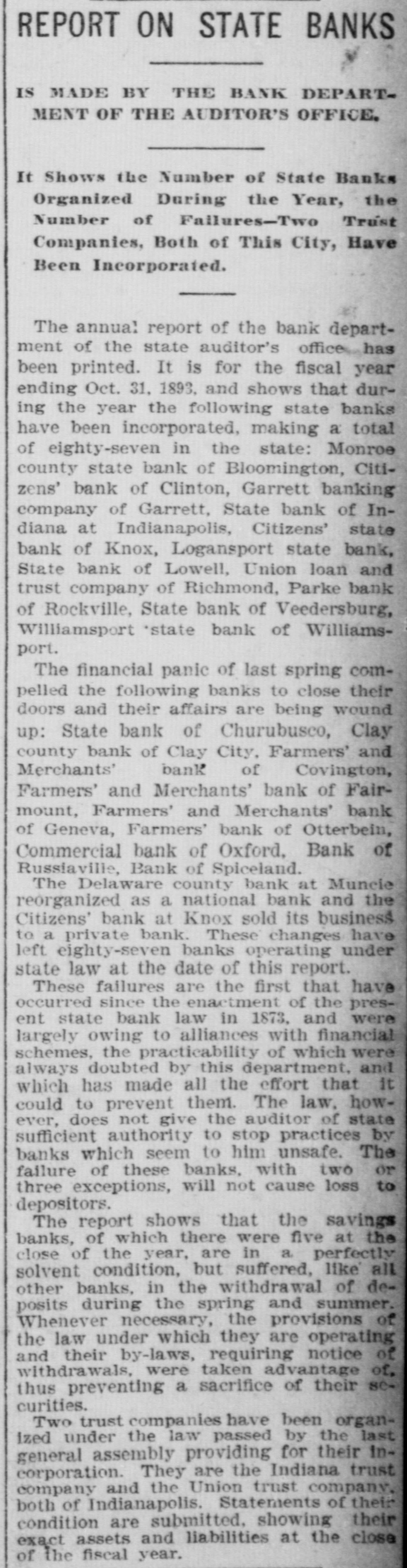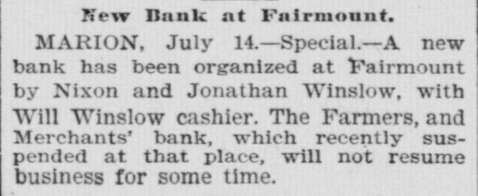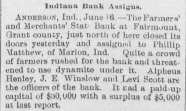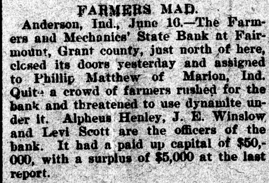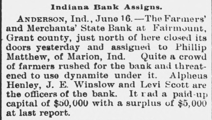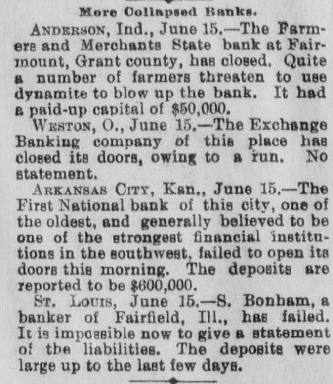 MONEY TROUBLES. Measure of Relief Proposed by the New York Clearing House. NEW YORK, June 15.-In view of the serious drain upon the banks here, caused by demands from the interior, the clearing house committee proposes that every clearing house center in the country issue clearing house certificates, which would make available for use between banks a vast amount of perfectly good assets which are now uncurrent. In the opinion of sagacious and conservative bank officers of this city, this would be a long step toward a reetoration of confidence. Receiver Appointed, SEATTLE, Wash., June 15.-The Ranier electric railway and power company and the Seattle consolidated street railof way a receiver company through have gone failure into to the dispose hands of bonds. D. T. Denny, the principal owner, to protect all his creditore has given trust deeds, and deeds and mortgages on all his property. His assets are much larger than his liabilities. Big One In Arkansas City. ARK ANSAS CITY, Kan., June 15.-The First national bank, of this city, one of the oldest and generally believed to be one of the strongest financial institutions in the southweet, failed to open its doors this morning. The deposits are reported to be $600,000. Threaten to Use Dynamite. ANDERSON, Ind., June 15.-The Farmers & Merchants' state bank at Fairmount, Grant county, is closed. Quite a number of farmers threaten to use dynamite and blow up the bank. It had a paid up capital of $50,000. Flood's Case With the Jury. SAN FRANCISCO, June 15.-The trial of J. W. Flood, charged with embezzlement of $164,000 from the Donabue-Kelly banking company, closed today and the jury retired. Temporary Help. NEW YORK, June 15.-The Clearing association has decided to issue six per cent loan certificates to tide those banks which need help over the present financial trouble. Dismond Dealers Assign. NEW YORK, June 5.-C. Cotier & Son, diamond dealers, assigned today. Their liabilities exceed $100,000, and their assets are equal in amount. Couldn't Stand the Pressure. WESTON, O., June 15.-The Exchange banking company of this place has closed its doors, owing to a run. One in Illinois. Sr. Louis, Mo., June 15.-S. Boneham, a banker of Fairfield, Ills., has failed.