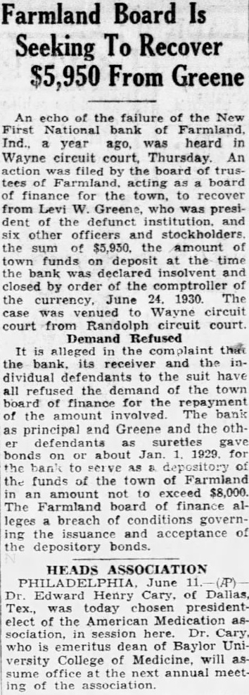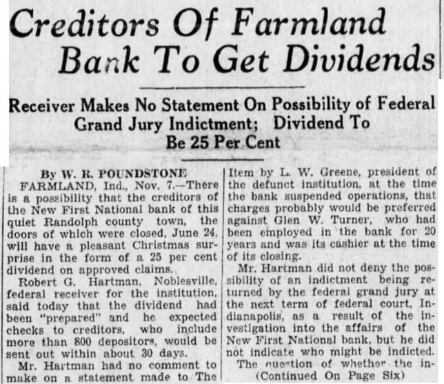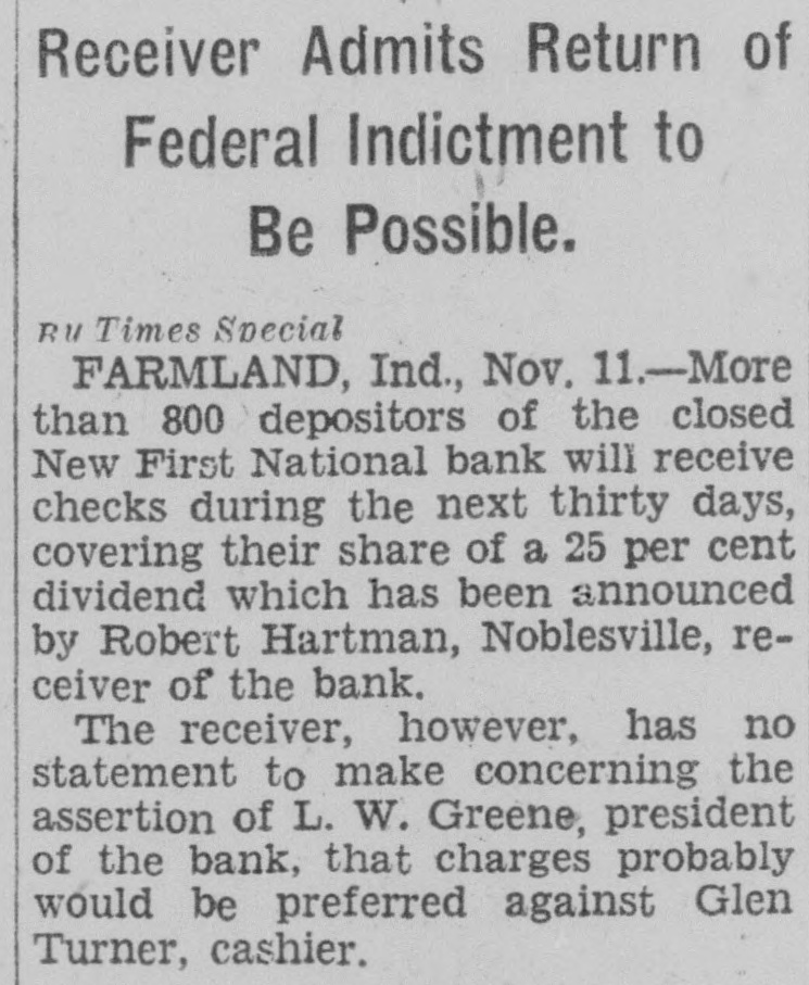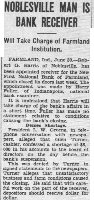 NOBLESVILLE MAN IS BANK RECEIVER Will Take Charge of Farmland Institution. FARMLAND, Ind., June 30.-Robert G. Harris of Noblesville, has been appointed receiver for the New First National Bank of Farmland, which closed its doors last week. The appointment was made by Harry Fuller, of Indianapolis, national bank examiner. It is understood that Harris will take charge of the bank's affairs in a short time. Fuller has made no statement relative to conditions causing the bank's closing. Denies Shortage. President L. W. Greene, in telephone conversation with newspapers, alleged that Glen Turner, cashier, confessed a shortage of $8,000 in his accounts to the board of directors on the day before the bank's suspension. This was denied by Turner in signed statements to newspapers. Turner alleges that unsatisfactory business and farm conditions caused the closing. He said that with careful work on the part of the receiver, depositors should reecive dollar for dollar.