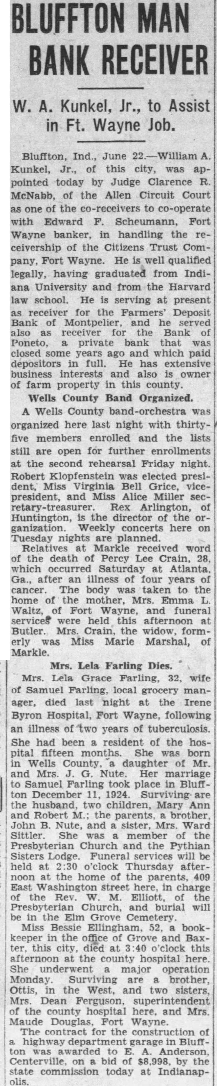 BLUFFTON MAN BANK RECEIVER W. A. Kunkel, Jr., to Assist in Ft. Wayne Job. Bluffton, Ind., June 22.-William A. Kunkel, Jr., of this city, was appointed today by Judge Clarence R. McNabb, of the Allen Circuit Court as one of the co-receivers to co-operate with Edward F. Scheumann, Fort Wayne banker, in handling the receivership of the Citizens Trust Company, Fort Wayne. He is well qualified legally, having graduated from Indiana University and from the Harvard law school. He is serving at present as receiver for the Farmers' Deposit Bank of Montpelier, and he served also as receiver the Bank of Poneto, a private bank that was closed some years ago and which paid depositors in full. He has extensive business interests and also is owner of farm property in this county. Wells County Band Organized. A Wells County band-orchestra was organized here last night with thirtyfive members enrolled and the lists still are open for further enrollments at the second rehearsal Friday night. Robert Klopfenstein was elected president, Miss Virginia Bell Grice, vicepresident, and Miss Alice Miller secretary-treasurer Rex Arlington, of Huntington, is the director of the organization. Weekly concerts here on Tuesday nights are planned. Relatives at Markle received word of the death of Percy Lee Crain, 28, which occurred Saturday at Atlanta. Ga., after an illness of four years of cancer The body was taken to the home of the mother, Mrs. Emma L. Waltz, of Fort Wayne, and funeral services were held this afternoon at Butler. Mrs. Crain, the widow, formerly was Miss Marie Marshal, of Markle. Mrs. Lela Farling Dies. Mrs. Lela Grace Farling, 32, wife of Samuel Farling, local grocery manager, died last night at the Irene Byron Hospital, Fort Wayne, following an illness of two years of tuberculosis. She had been a resident of the hospital fifteen months. She was born in Wells County daughter of Mr. and Mrs. Nute. Her marriage to Samuel Farling took place in Bluffton December 11, 1924. Surviving are the husband, two children, Mary Ann and Robert M.: the parents, brother, John B. Nute, and sister, Mrs. Ward Sittler. She was a member of the Presbyterian Church and the Pythian Sisters Lodge. Funeral services will be held at 2:30 o'clock Thursday afternoon at the home of the parents, 409 East Washington street here, in charge of the Rev. M. Elliott, of the Presbyterian Church, and burial will be in the Elm Grove Cemetery. Miss Bessie Ellingham, 52, bookkeeper in the office of Grove and Baxter, this city, died at o'clock this afternoon at the county hospital here. She underwent major operation Monday are a brother, Ottis, in the West. and two sisters, Mrs. Dean Ferguson, superintendent of the county hospital here. and Mrs. Maude Douglas, Fort Wayne The contract for the construction of highway department garage in Bluffton was awarded to Anderson, Centerville, on bid of $8,998, by the state commission today at Indianapolis.