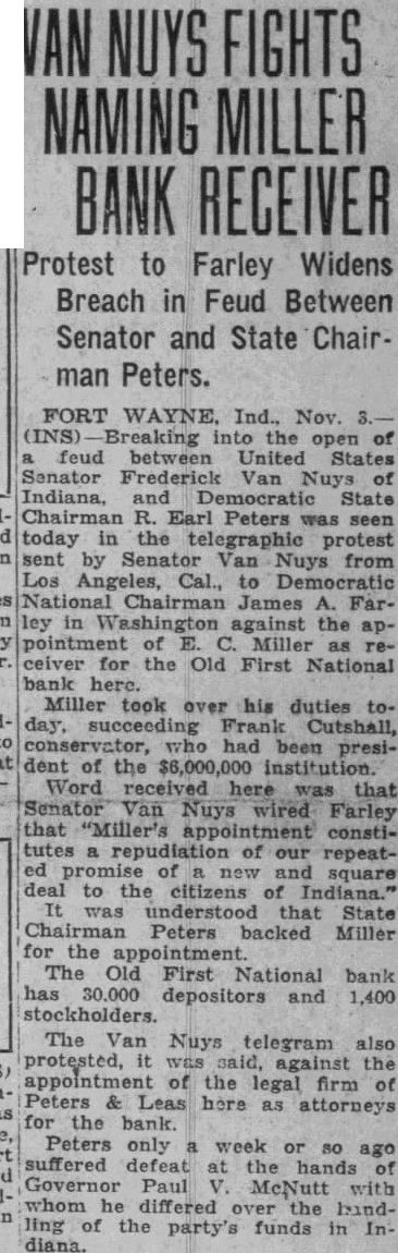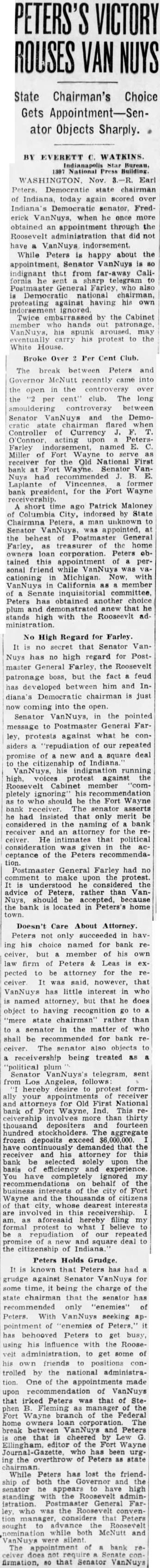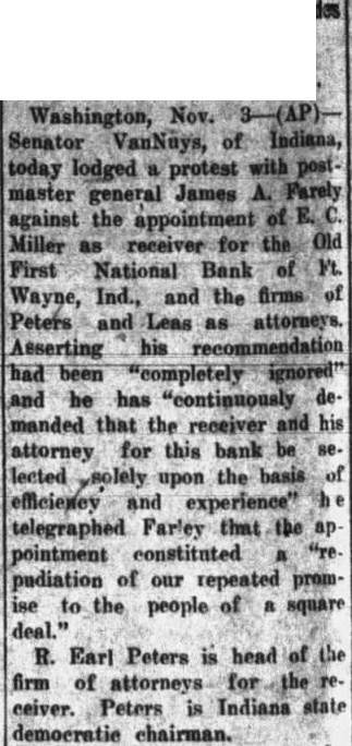 Doesn't Care About Attorney. Peters not succeeded in having his choice named for bank receiver, but member of his own firm of Peters Leas expected to be for the ceiver It said, that VanNuys has little interest in who named but that he does object to having recognition go to "mere state chairman" rather than to senator the matter who shall be recommended for bank resenator objects to receivership being treated as "political Senator VanNuys's telegram, sent from Angeles, follows hereby desire to form ally your of receiver for Old First National bank of Fort This rethan thirty thousand depositers fourteen hundred stockholders. The aggregate frozen deposits exceed $6,000,000. that the and his attorney for this bank be selected upon the efficiency and experience. have completely ignored on of of the city of Fort Wayne and the citizens that dearest interests are involved in receivership as aforesaid hereby filing my formal protest to what believe to our repeated of and square deal to the citizenship of Indiana.