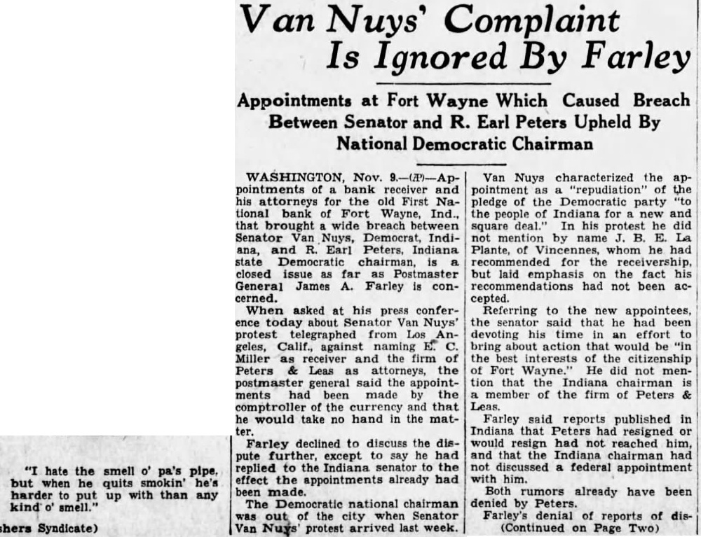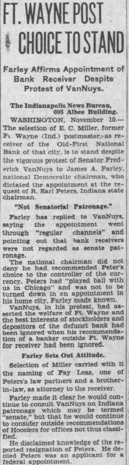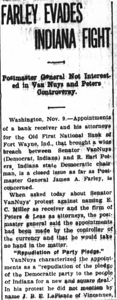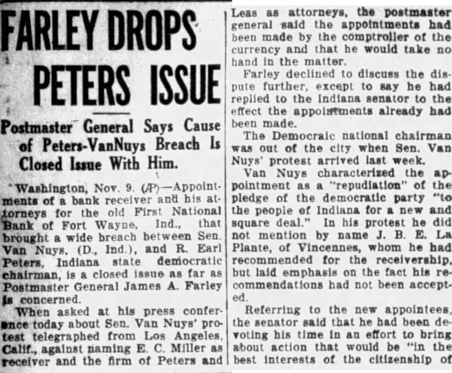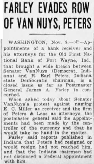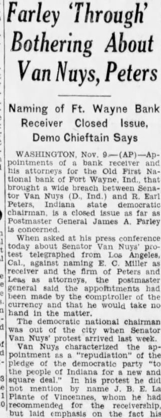 No High Regard for Farley It is no secret that Senator VanNuys has no high regard for Postmaster General Farley, the Roosevelt patronage boss, but the fact feud has developed him and Indiana's Democratic chairman is just now coming into the Senator VanNuys, in the pointed message Postmaster General Farley, protests against what he considers "repudiation of our repeated promise of and square deal the of VanNuys, his indignation running high, voices protest against the Roosevelt Cabinet member pletely his be the Fort Wayne bank The asserts he had that only merit considered in the naming of bank receiver and an attorney for the ceiver He intimates that political given the ceptance of the Peters recommendaPostmaster General Farley had no comment protest. understood he considered the advice of Peters, rather than VanNuys, should accepted, because the bank is located in Peters's home