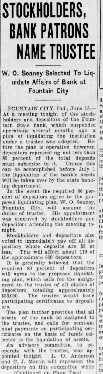 STOCKHOLDERS, BANK PATRONS NAME TRUSTEE W. O. Seaney Selected To Liquidate Affairs of Bank at Fountain City FOUNTAIN CITY, Ind., June meeting tonight of the stockholders and depositors of the Fountain State bank, which suspended several months ago, plan liquidating the institution under trustee adopted. Before the plan operative, however, depositors not less than percent the total deposits must Unless this be accomplished before July liquidation of the bank's assets will be taken over by the state banking the event the required 80 percent depositors agree the posed liquidating plan, Seaney, Fountain City, assume duties trustee. His appointment approved and depositors attending the meeting Stockholders and depositors also the voted to pay off depositors whose deposits are $5 less. This will affect about 119 the 600 depositors. generally believed that the required of depositors will agree the proposed liquidating which calls the assignment the trustee of all claims depositors, totalling $53,000. trustee would participating certificates to depositThe plan further provides that all assets the bank be assigned the trustee, calls for semi-annual payments participating tificates on the basis of funds lected the liquidation of assets. An advisory committee, to velt operate the trustee, pointed tonight. Anderson and Martin will represent the this (Continued on Page Two)