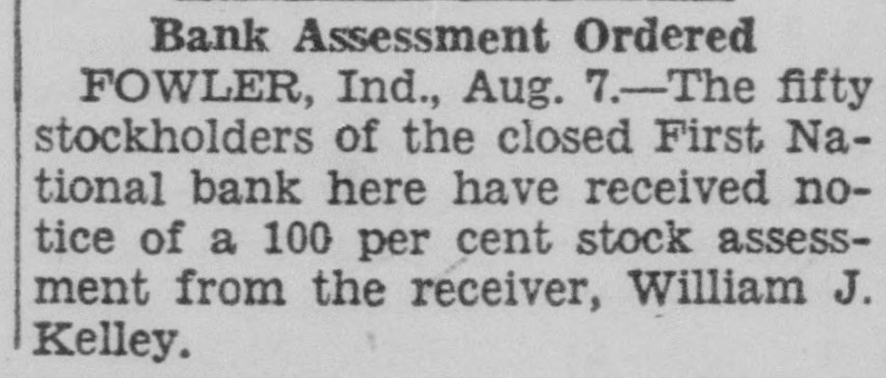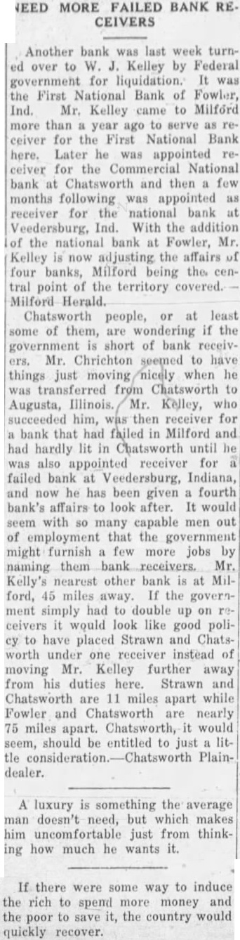 Another bank was last week turned over to W. J. Kelley by Federal government for liquidation. It was the First National Bank of Fowler, Ind. Mr. Kelley came to Milford more than year ago to serve as receiver for the First National Bank here. Later he was appointed receiver for the Commercial National bank at Chatsworth and then few months following was appointed as receiver for the national bank at Veedersburg, Ind. With the addition of the national bank at Fowler, Mr. Kelley is now adjusting the affairs of four banks, Milford being the central point of the territory covered. Milford Herald. Chatsworth people, or at least some of them, are wondering if the government is short of bank receivers. Mr. Chrichton seemed to have things just moving nicely when he was transferred from Chatsworth to Augusta, Illinois. Kelley, who succeeded him, was then receiver for bank that had failed in Milford and had hardly lit in Chatsworth until he was also appointed receiver for failed bank at Veedersburg, Indiana, and now he has been given a fourth bank's affairs to look after. It would seem with so many capable men out of employment that the government might furnish few more jobs by naming them bank receivers. Mr. Kelly's nearest other bank is at Milford, 45 miles away. If the government simply had to double up on receivers would look like good policy to have placed Strawn and Chatsworth under receiver instead of moving Mr. Kelley further away from his duties here. Strawn and Chatsworth are 11 miles apart while Fowler and Chatsworth are nearly 75 miles apart. Chatsworth, it would seem, should be entitled to just little Plaindealer.
