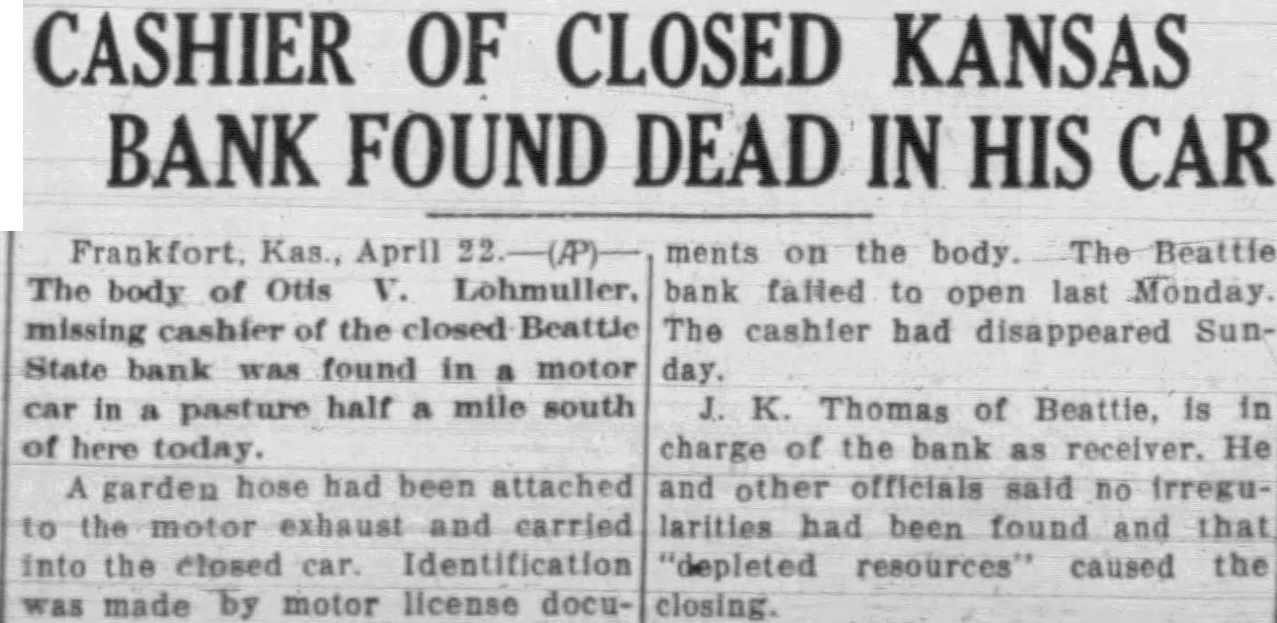 Schnelder Saw Him Last George Schneider of the Schneider Clothing company is believed to be the last person who saw Lohmuller before he left town at 11:45 o'clock. The two men were getting their Sunday mail and Schneider said that Otis acted the "same usual. After the men got their mail Schneider saw Lohmuller get in his and drive main street. That was the west on last he saw of him. know that time is correct," said Schneider, "because looked my watch. was about train time." Oscar Schwarz, of the Standard Filling station and garage, in which Lohmuller has kept his car for the past six also Lohmuller few before noon. Schwarz said that Lohmuller came to the drove out his had rage, car, in the radiator, and drove water put south. believed that he drove from there to the post office where he was seen by Schneider At the time the bank was closed the were said to be $70,000. Of deposits this amount of the name of Marshall county. Oakley, county treasurer, said yesterday that this amount covered by of $3,000. This bond really bond $1,000 bonds, one an Arkansas three City, Kas., issue bearing four per cent, issue of Kas., second 4.5 cent, and the third, bearing per also for $1,000 an issue of Lakin, Kas., bearing 4.5 per cent interest. The bank's December 31 statement the state banking department listed $25,000; surplus, $2,500; capital, $85,349; loans, $93,849, and deposits, total assets, $118,359. The bank, described as familyorganized in 1906 with owned, was Lohmuller, president, and Lohmuller, cashier. Mrs. Otis Lohmuller is now Besides his wife and daughter, Mary, Lohmuller also has two other daughMrs. Frank Schulte, Cincinters, and Mrs. E. White, nati, Ohio., Beattie.