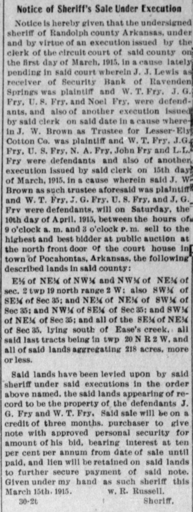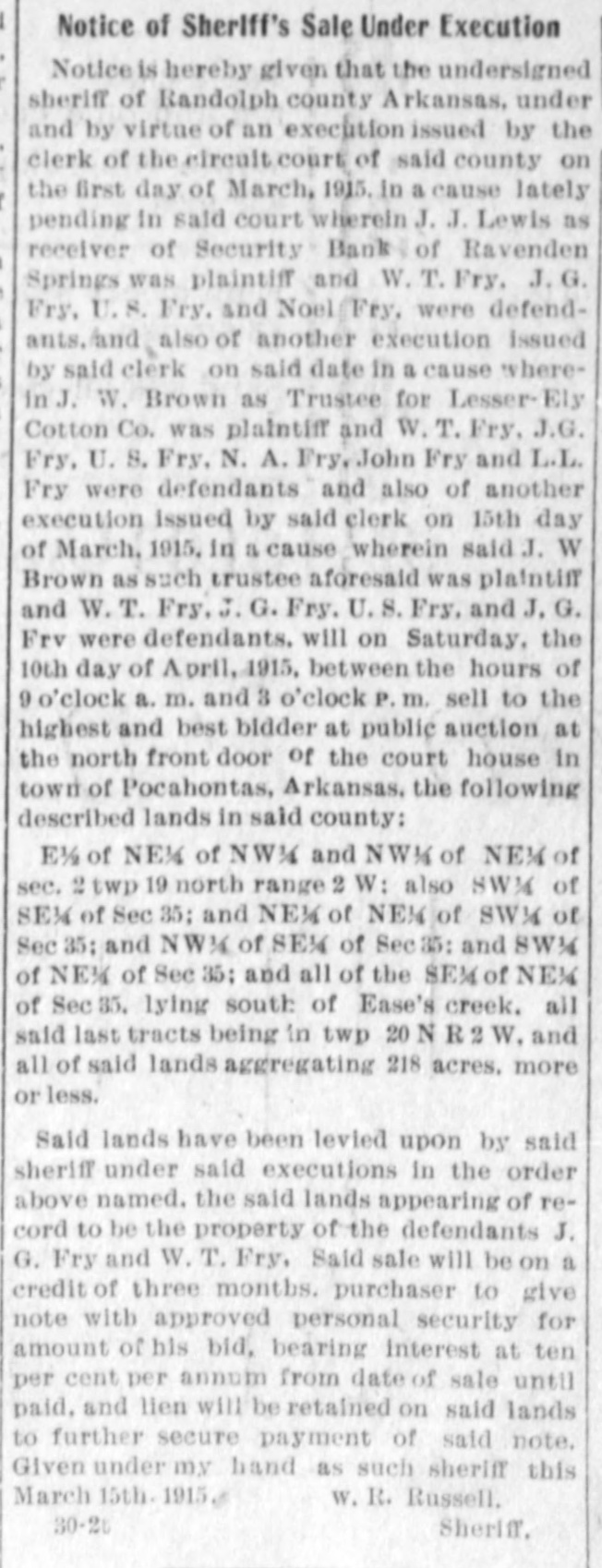 Notice of Sheriff's Sale Under Execution Notice is hereby given that the undersigned sheriff of Randolph county Arkansas, under and by virtue of an execution issued by the clerk of the circuit court of said county on the first day of March. 1915. in a cause lately pending in said court wherein J. J. Lewis as receiver of Security Bank of Ravenden Springs was plaintiff and W. T. Fry. J.G. Fry, U.S. Fry. and Noel Fry, were defendants, and also of another execution issued by said clerk on said date in a cause wherein J. W. Brown as Trustee for Lesser-Ely Cotton Co. was plaintiff and W. T. Fry, J.G. Fry, U. S. Fry, N. A. Fry, John Fry and L.L. Fry were defendants and also of another execution issued by said clerk on 15th days of March, 1915. in a cause wherein said J. WBrown as such trustee aforesaid was plaintiff and W.T. Fry. J. G. Fry. U. S. Fry. and J. G. Frv were defendants, will on Saturday, the 10th day of April, 1915, between the hours of 9 o'clock a. m. and 3 o'clock P.m. sell to the highest and best bidder at public auction at the north front door of the court house in town of Pocahontas, Arkansas. the following described lands in sald county: E½ of NEW of NWM and NWM of NEW of sec. 2 twp 19 north range 2 W: also SWM of SEM of Sec 35; and NEM of NEW of SWM of Sec 35: and NW½ of SEM of Sec 35; and SWM of NEW of Sec 35; and all of the SEM of NEM of Sec 35. lying south of Ease's creek. all said last tracts being in twp 20 N R 2 W, and all of said lands aggregating 218 acres, more or less. Said lands have been levied upon by said sheriff under said executions in the order above named. the said lands appearing of record to be the property of the defendants J. G. Fry and W. T. Fry. Said sale will be on a credit of three months. purchaser to give note with approved personal security for amount of his bid, bearing interest at ten per cent per annum from date of sale until paid, and lien will be retained on said lands to further secure payment of said note. Given under my hand as such sheriff this W. R. Russell. March 15th. 1915. Sheriff. 30-2t